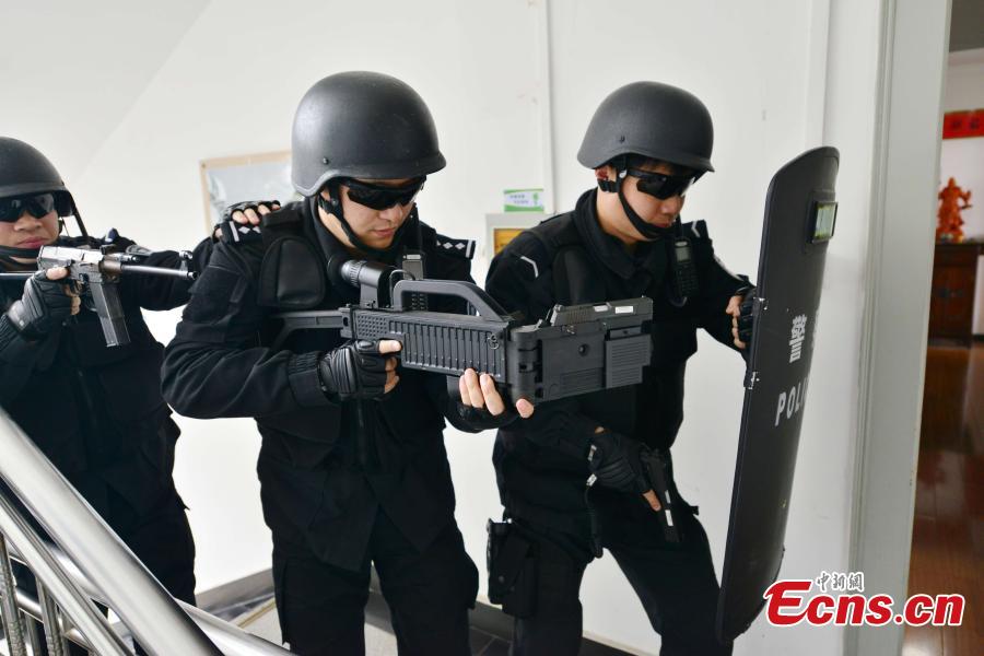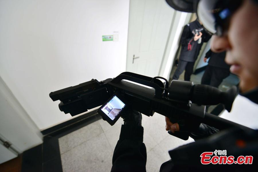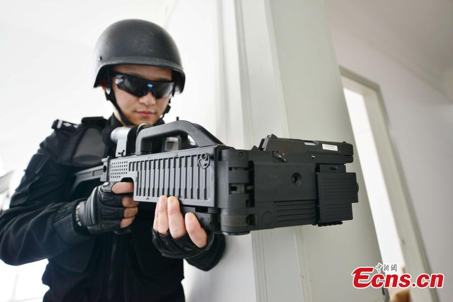 A police officer takes a weapon that can shoot around a corner at a training center in Shanghai, March 4, 2015. The special weapon bending horizontally allows its operator to both see and attack an armed target, without exposing the operator to counterattack. (Photo: China News Service/ Shen Chunchen)