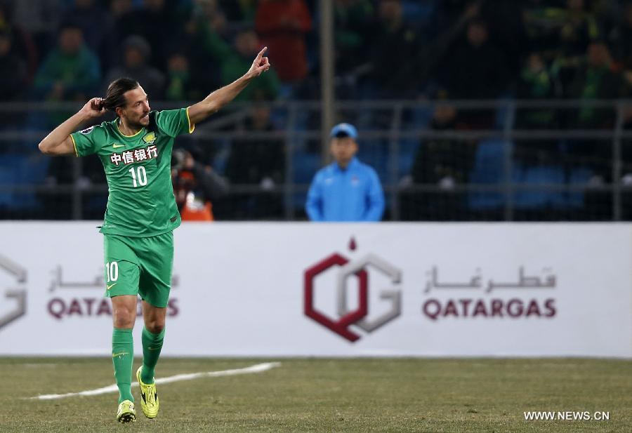 Dejan Damjanovic of China's Beijing Guoan celebrates after scoring against South Korea's Suwon Samsung FC during their Group G second round match at the 2015 AFC Champions League in Beijing, capital of China, March 4, 2015. Beijing Guoan won 1-0.(Photo: Xinhua/Wang Lili)