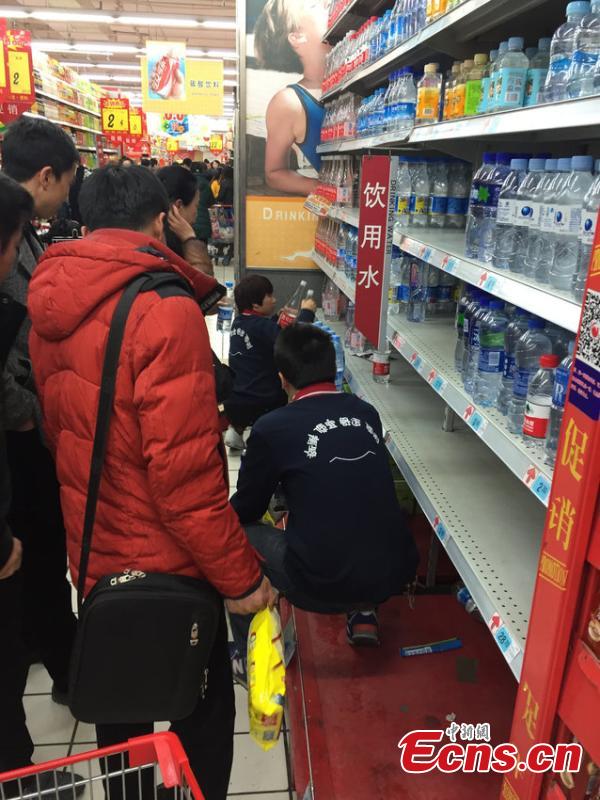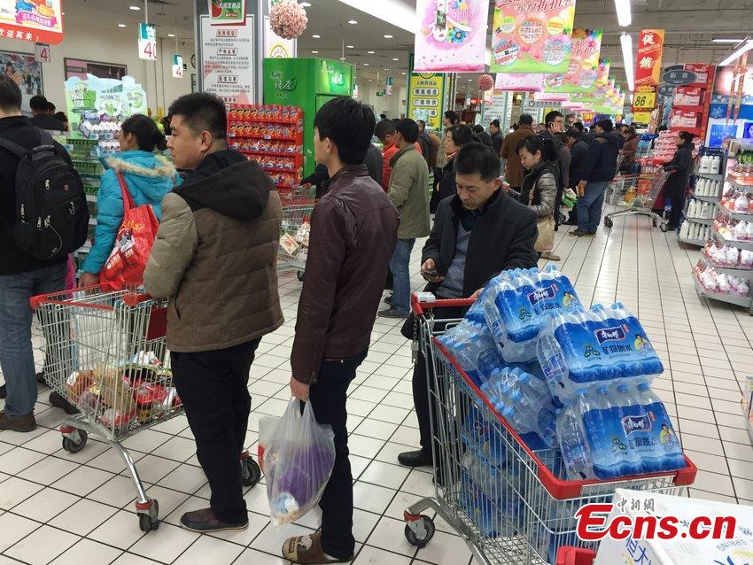 Customers buy bottled water at a supermarket in Lanzhou, Northwest China’s Gansu province, March 4, 2015. Odors in tap water, for residents near a printing plant in Qilihe district, caused panic purchase of bottled water. Tap water in downtown Lanzhou were found to contain excessive levels of benzene in last year, also driving residents to supermarkets or community grocery stores to stock up on bottled water. (Photo/CFP)