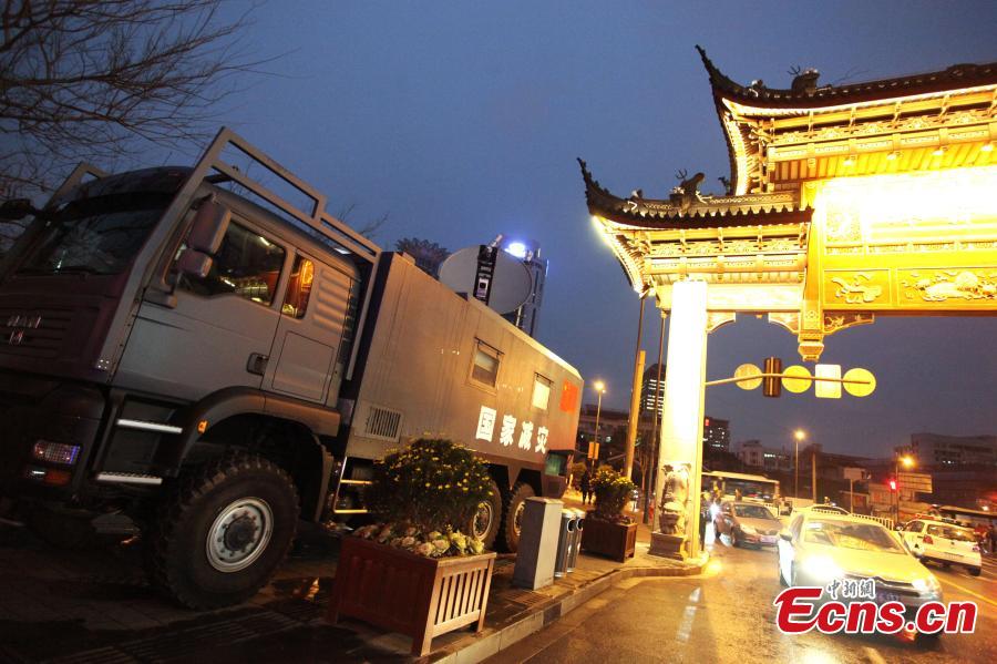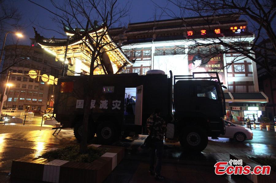 A high-tech vehicle is deployed to supervise visitors' flows near the Yuyuan Garden in Shanghai, March 5, 2015. To ensure the safety of visitors on the Lantern Festival, authorities in Shanghai have strengthened supervision of gatherings near local scenic spots. (Photo/Zhang Hengwei)