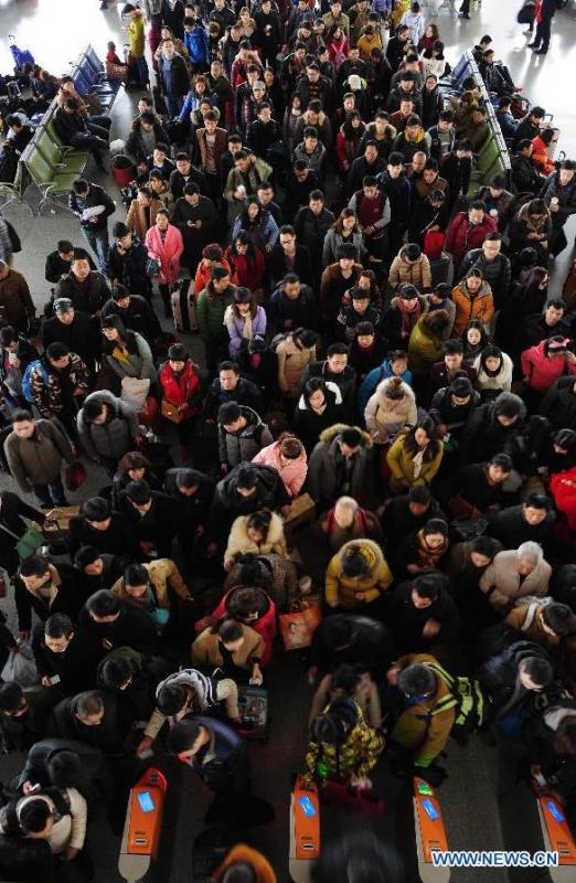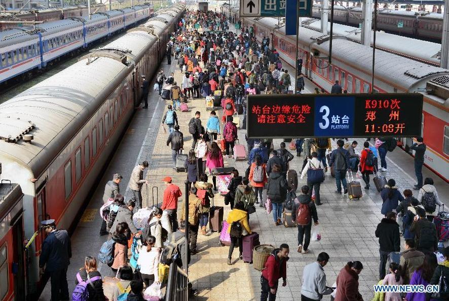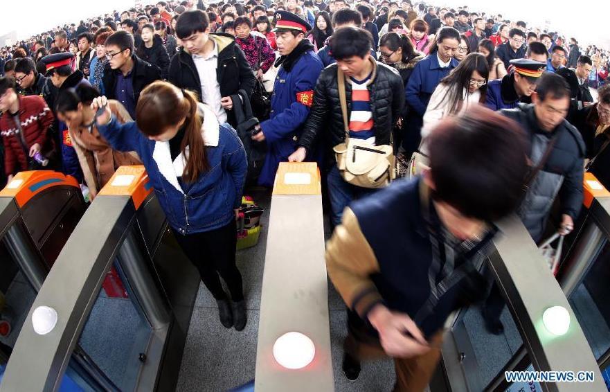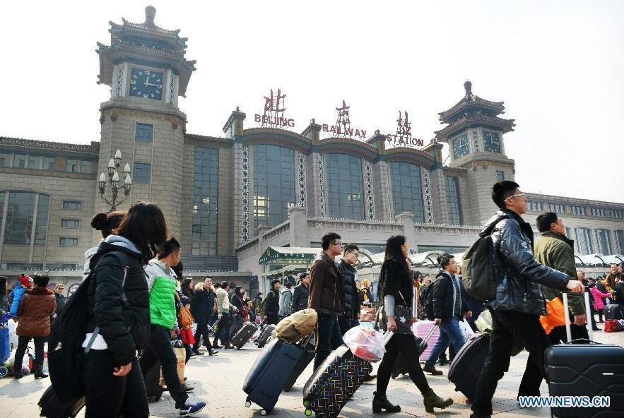 Passengers walk in front of Beijing Railway Station in Beijing, capital of China, March 6, 2015. The railway stations around the nation witnessed surging passenger flows on Friday as the Spring Festival came to end and people started to return to school and work. (Photo: Xinhua/Yang Baosen)