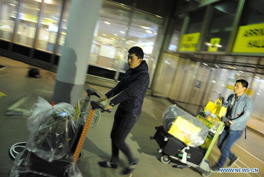 Chinese passengers walk out of the Sheremetyevo airport after being released in Moscow, Russia, March 7, 2015. Dozens of Chinese passengers were detained at the Sheremetyevo airport on Friday for bringing food materials which Russian Customs officials considered as drugs, according to the Chinese Embassy to Russia. (Photo: Xinhua/Dai Tianfang)