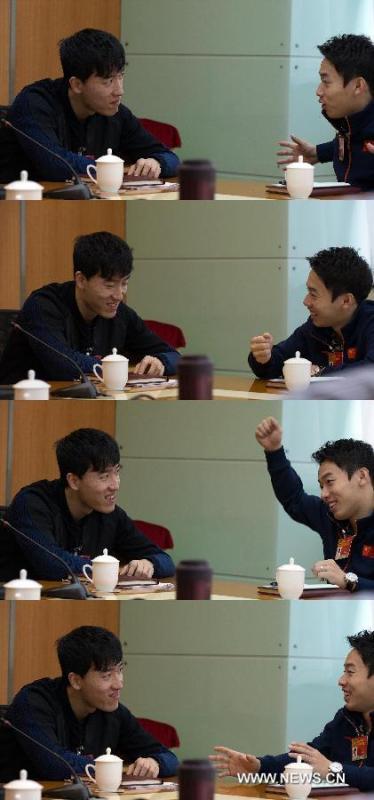 The combination photo taken on March 8, 2015 shows athletes Liu Xiang (L) and Zou Kai, members of the 12th National Committee of the Chinese People's Political Consultative Conference (CPPCC), discuss on sports reform at the intervals of the third session of the 12th CPPCC National Committee in Beijing, capital of China. (Xinhua/Cai Yang)