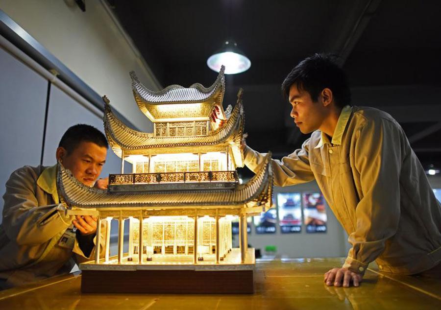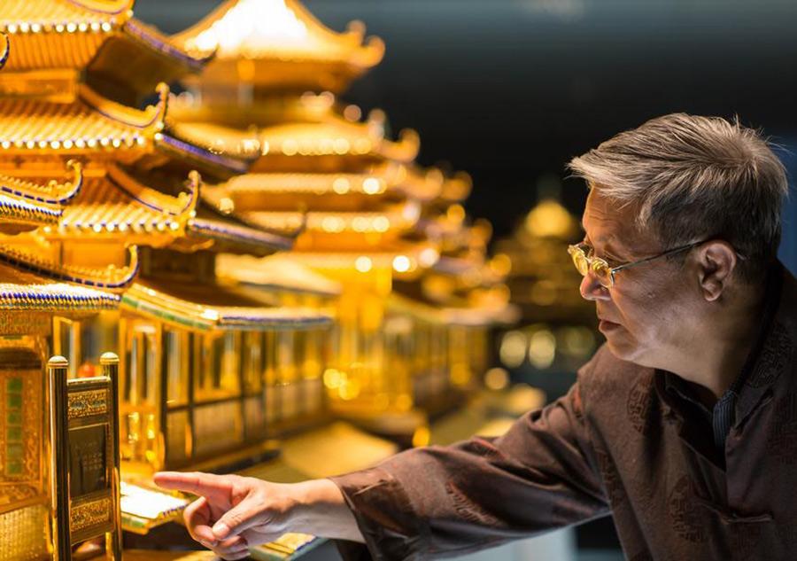 Yao Yingchun with the biggest filigree inlay artwork in the world at a museum in Guangdong province. The piece is 5.2 meters long and 2 meters high, decorated with more than 30,000 pieces of jade and gems. It combines 7 craft techniques. Filigree inlay, one of the eight traditional arts and crafts of Beijing, includes complex techniques. An exhibition opened in Paris on March 5 featuring exquisite filigree inlay work by Yao and his colleagues. A masterpiece of filigree inlay ruyi, or ceremonial scepter, took about 3 months to produce and is a feature of the exhibition.