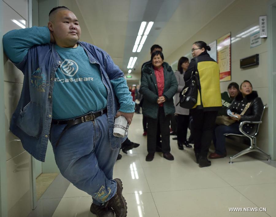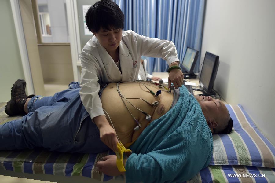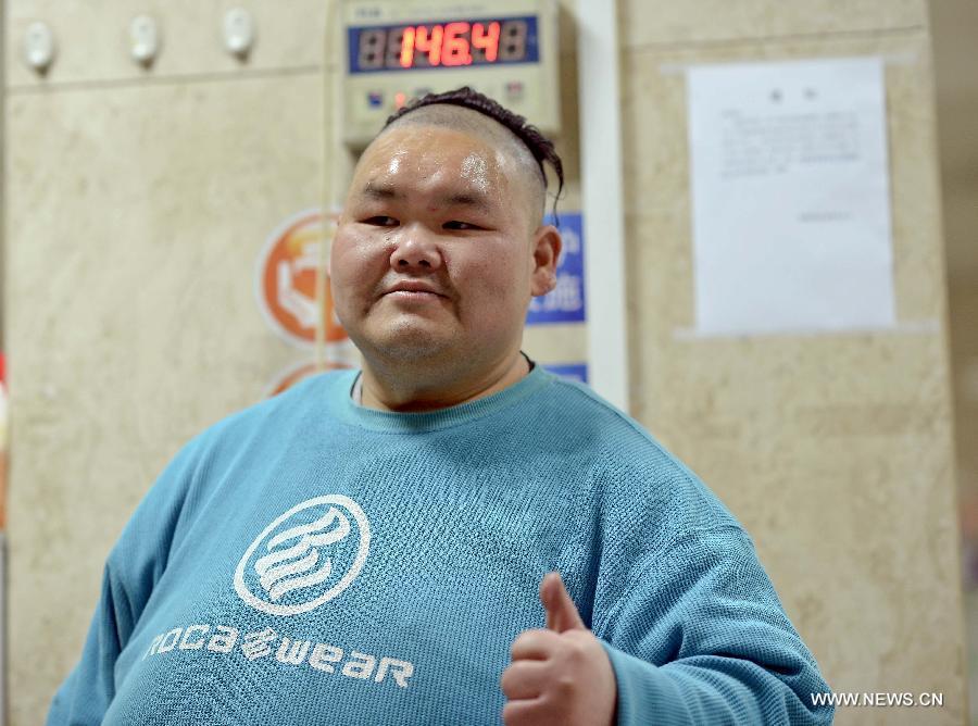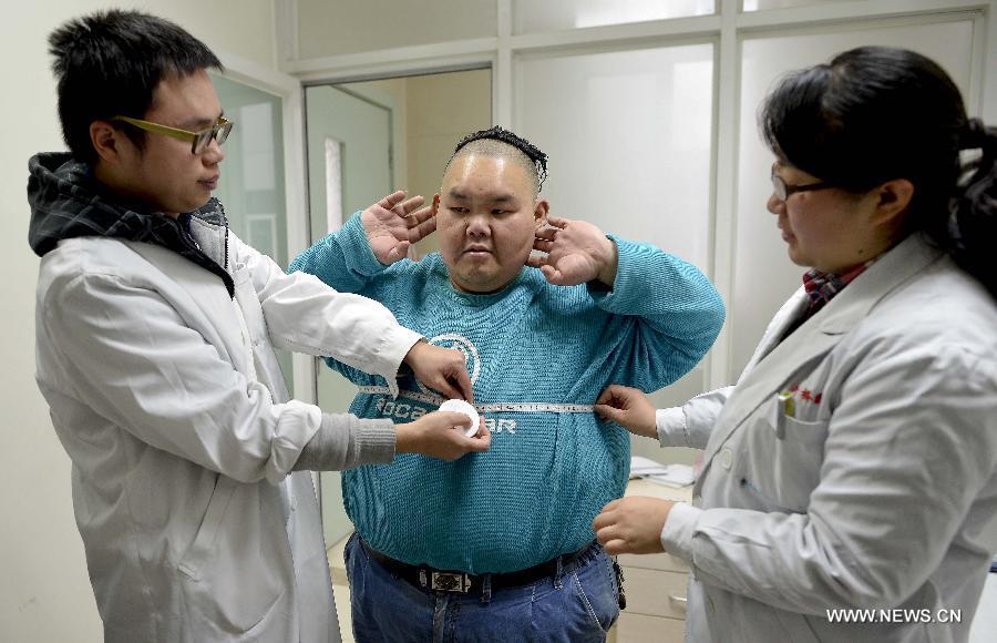 Liang Yong weighs himself on a electronic scale displaying 146.4 kg in a hospital in southwest China's Chongqing, March 9, 2015. Liang Yong, who was named as "the fattest man in China" by China Records Headquarters when he weighed 225 kg in 2007, successfully loses 80 kg after five-year medical treatment. (Xinhua/Chen Cheng)