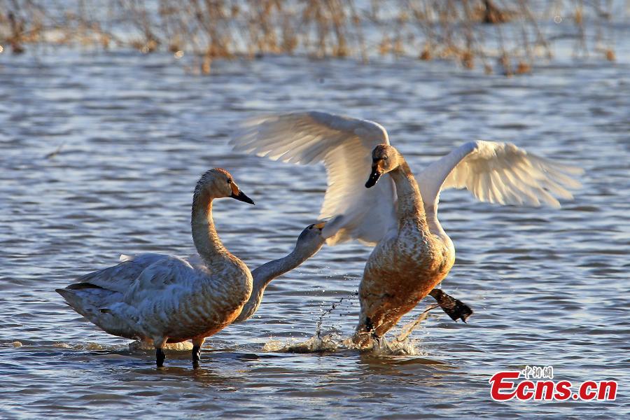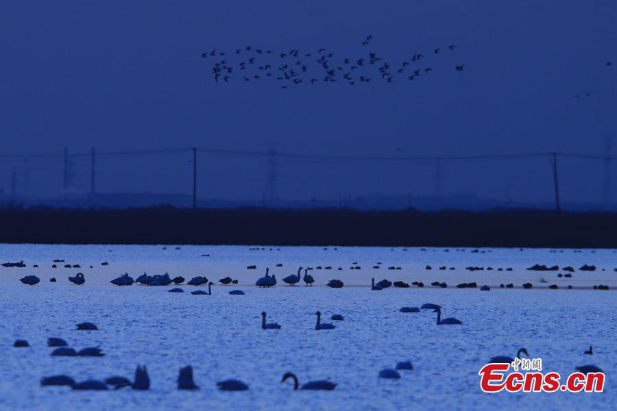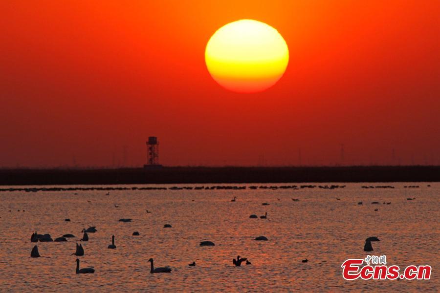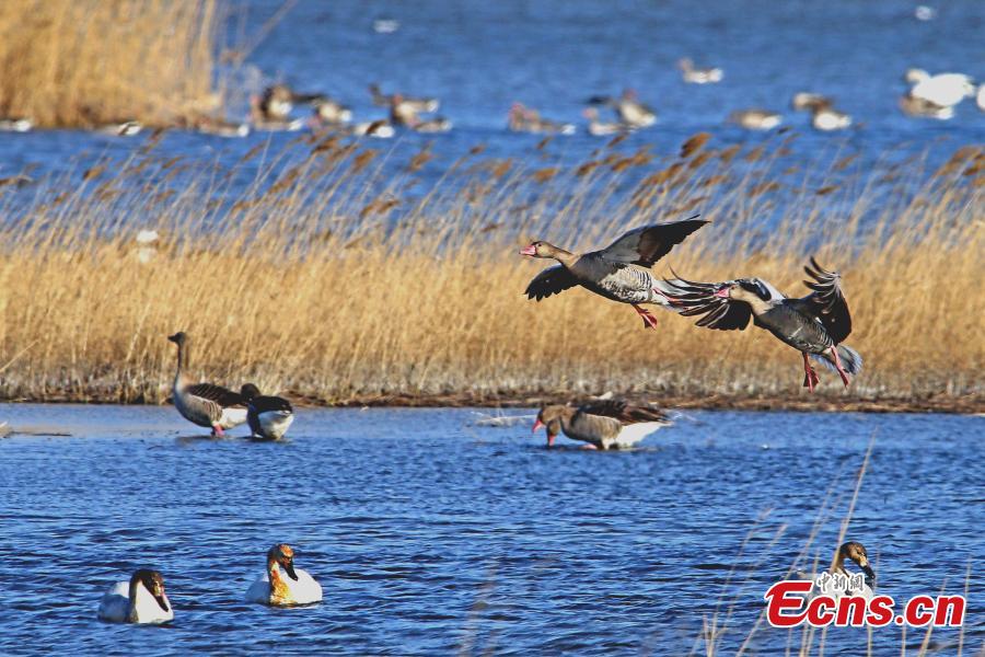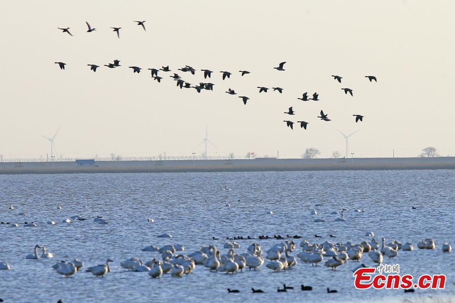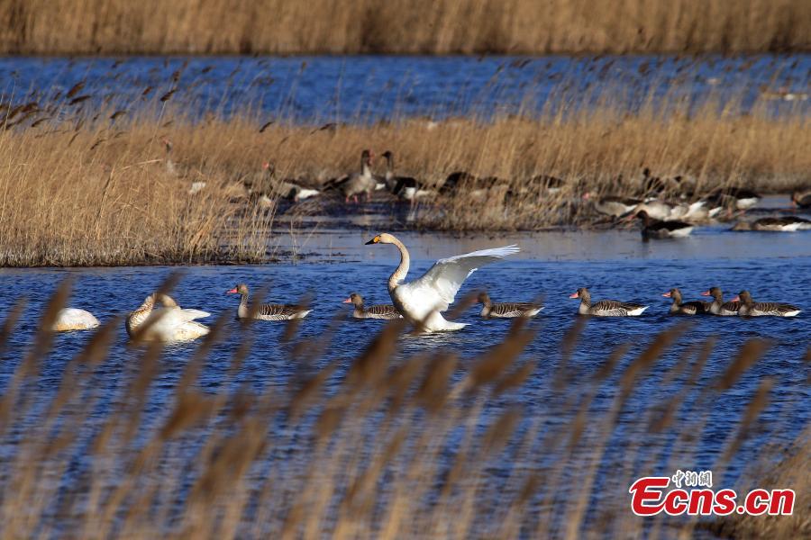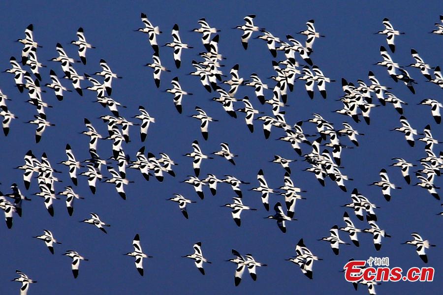 Migratory birds fly over the Beidagang wetland nature reserve in North China's Tianjin municipality, March 9, 2015. The wetland, covering 34,887 hectares, is a winter home to tens of thousands of migratory birds, which are leaving as temperatures rise. (Photo: China News Service/Tong Yu)