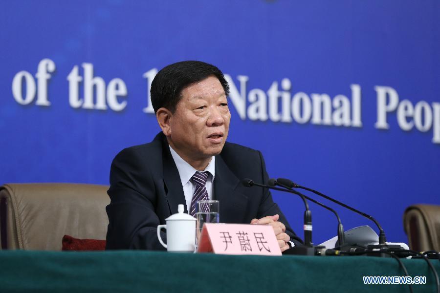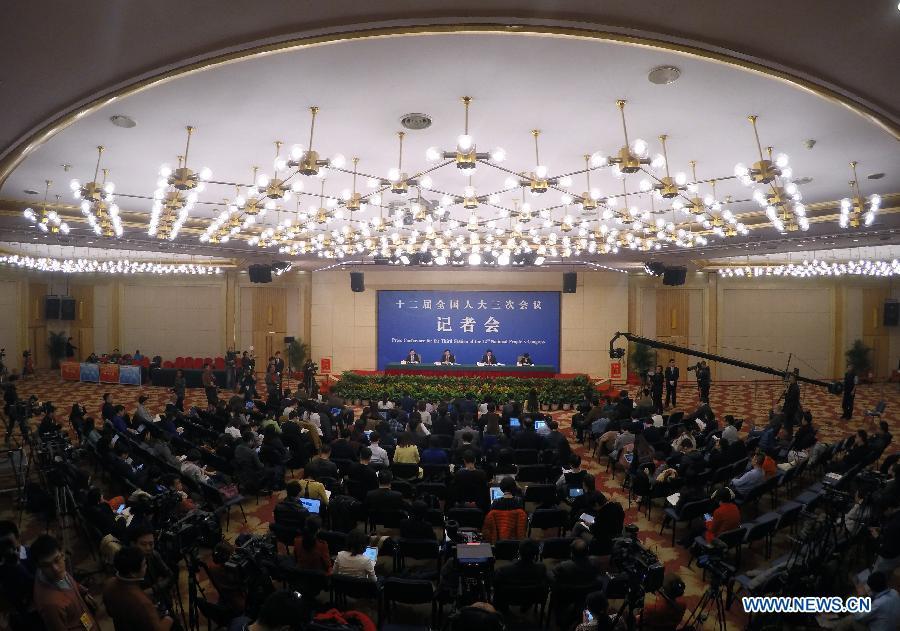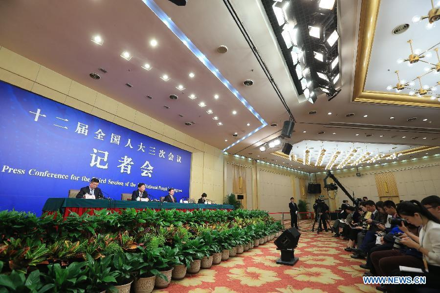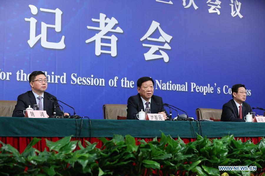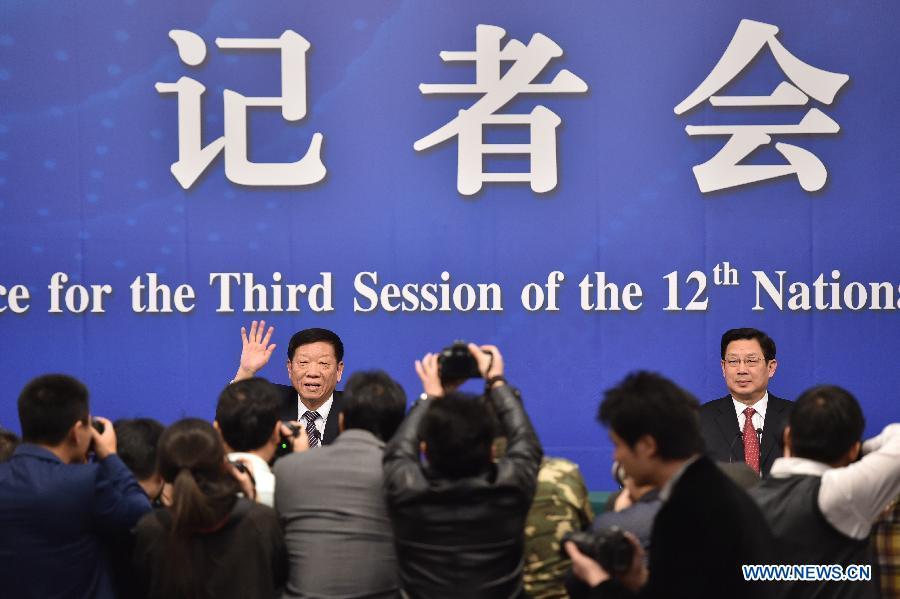 Yin Weimin(back L), minister of human resources and social security, and his deputy Hu Xiaoyi give a press conference during the third session of China's 12th China's National People's Congress (NPC) in Beijing, capital of China, March 10, 2015. (Xinhua/Li Xin)