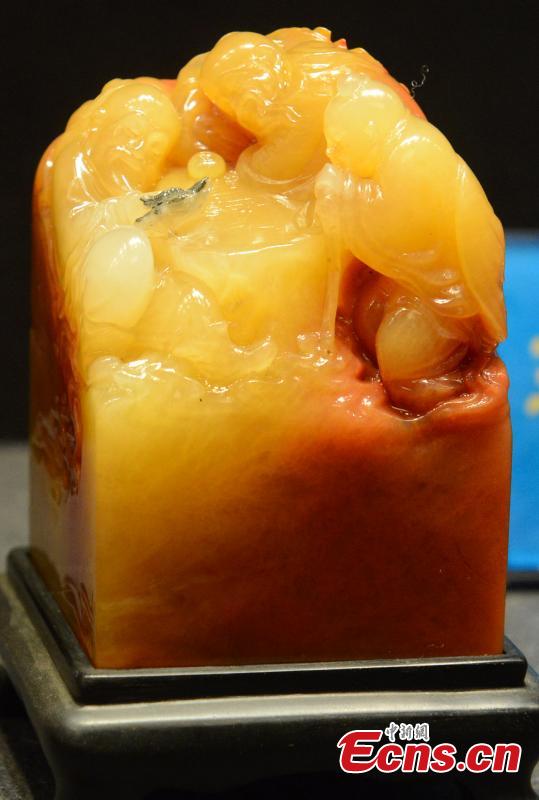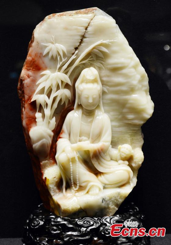 A Shoushan stone carving is on display in Fuzhou, East China’s Fujian province, March 10, 2015. The national and provincial masters present about 20 Shoushan stone carvings featuring a broad range of topics, such as Buddhist figures, in the exhibition. With a soft, smooth surface and various colors, Shoushan stone from a mountain called Shoushan in the province, is an ideal material for carving and is known as "the top grade-colored stone for carving." It is characterized by exquisiteness, smoothness, softness, and cohesion. (Photo: China News Service/Liu Kegeng)