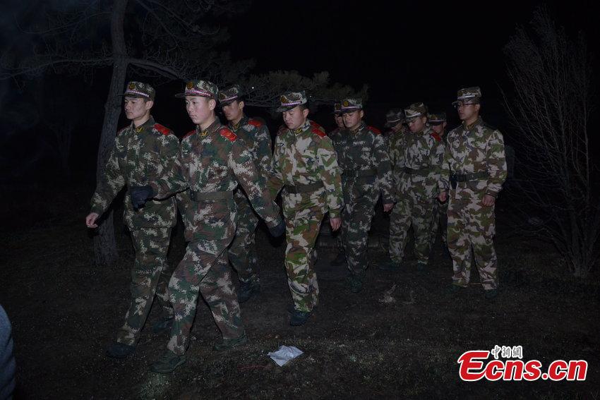 Firefighters conduct a search mission at a cemetery at night during training in Pingliang, Northwest China’s Gansu province, March 10, 2015. The program, including patrolling, searching, sleeping rough, and jogging, aimed to improve the psychological quality of firefighters, organizer said. (Photo/IC)