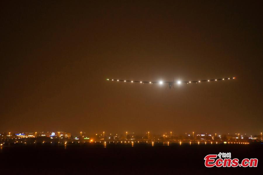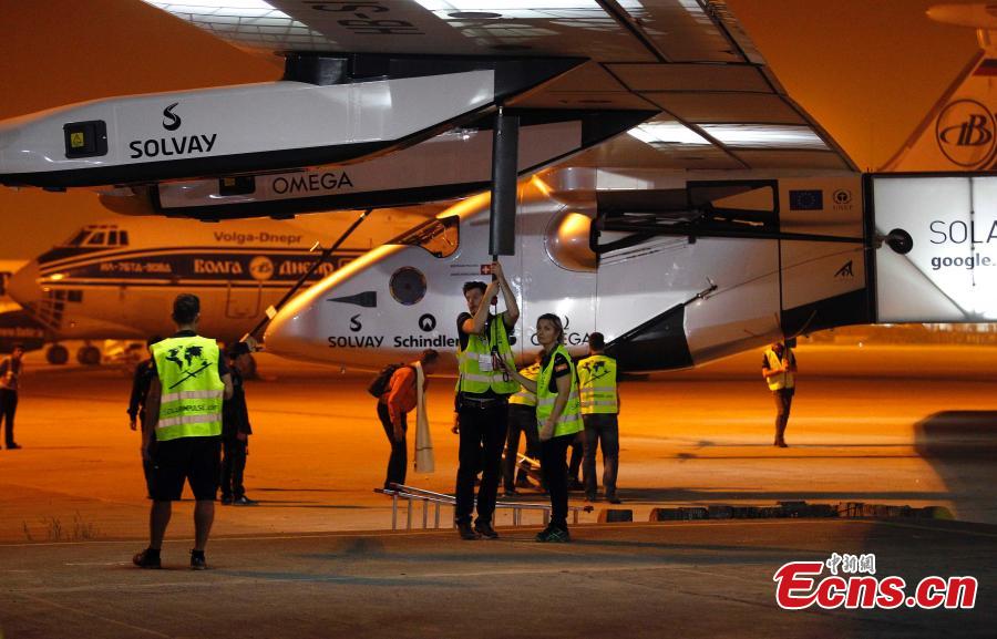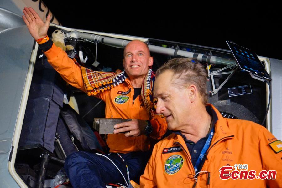 Swiss pilot Andre Borschberg (front) and fellow Swiss aviator Bertrand Piccard (back) wave to greeters after landing the Solar Impulse II, the first solar-powered plane scheduled to circumnavigate the world, at Ahmedabad in India, March 10, 2015. Its flight plan called for stops in various cities, including Muscat in Oman, Varanasi and Ahmedabad in India, Chongqing and Nanjing in China and Phoenix, Arizona in the United States. The aircraft flies at about 28 mph, propelled by energy from batteries recharged by more than 17,000 solar cells. (Photo provided to China News Service)