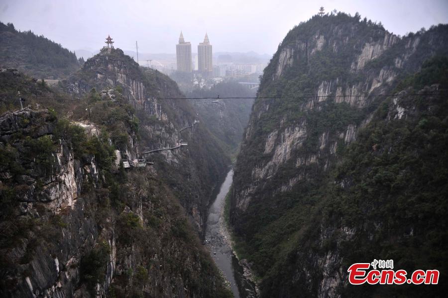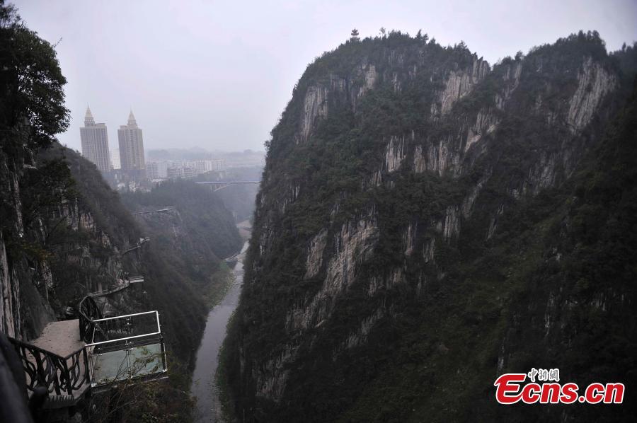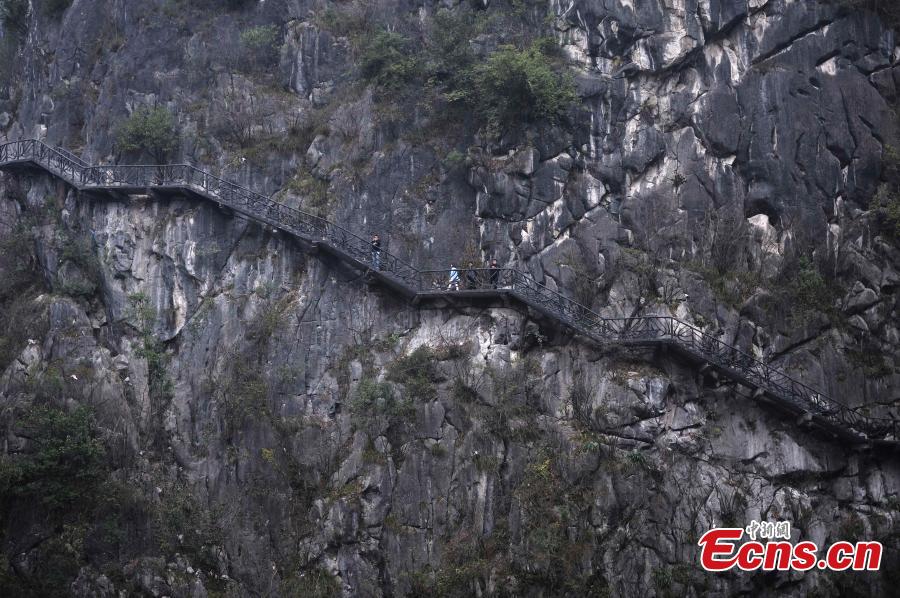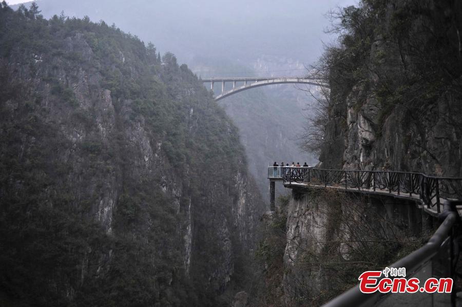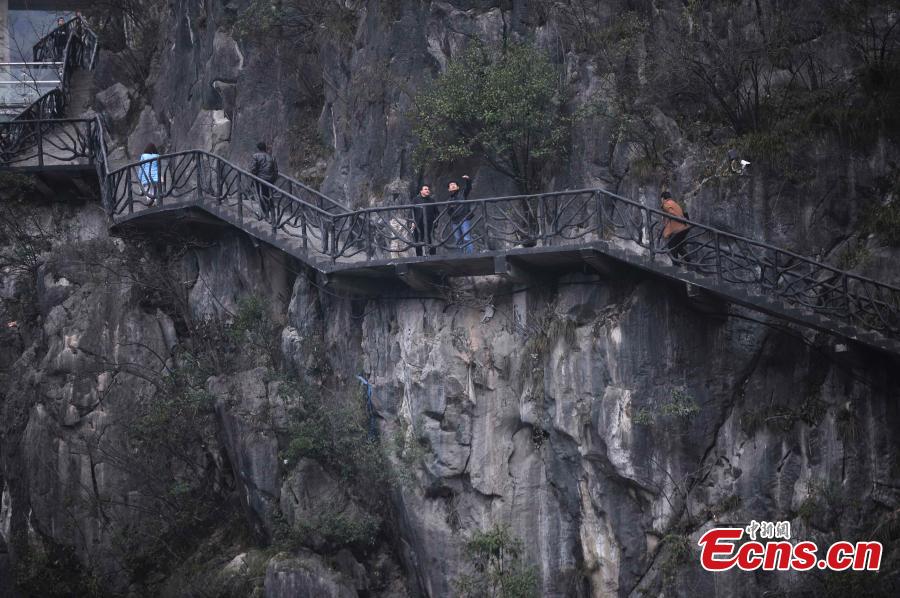 A new walkway along cliffs is nearly complete at the scenic Wuling Mountain in Southwest China's Chongqing municipality, March 11, 2015. The walkway is 800 meters long and has the highest depth of 500 meters. (Photo: China News Service/Chen Chao)
