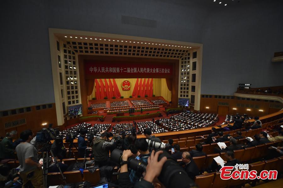 Zhou Qiang, president of the Supreme People's Court (SPC), delivers a report on the SPC's work during the third plenary meeting of the Third Session of the 12th National People's Congress (NPC) at the Great Hall of the People in Beijing, capital of China, March 12, 2015. (Photo: China News Service/Jin Shuo)