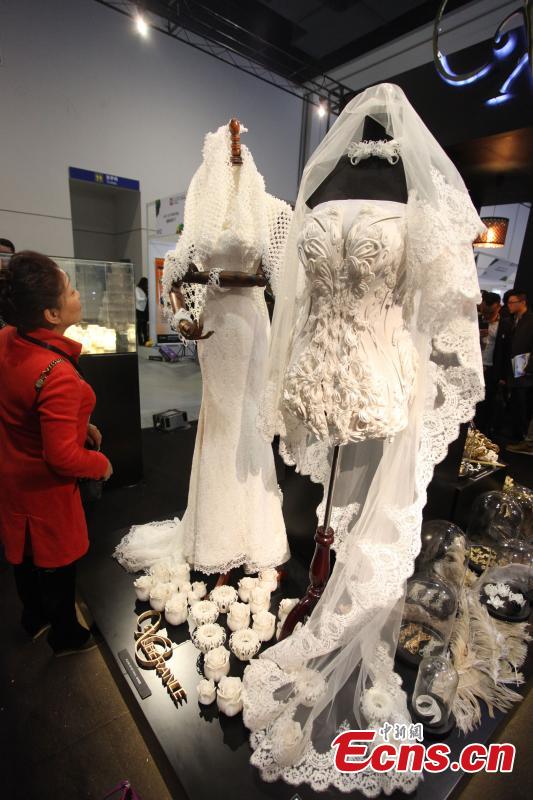 Visitors look at 3D-printed wedding dresses at the TCT + Personalize Asia in Shanghai, March 12, 2015. The wedding dress takes one week to make on 3D printer and costs about 20,000 yuan ($3,200). TCT + Personalize Asia show is a leading event dedicated to 3D printing, additive manufacturing and product development for every level of interest from hackerspace to aerospace, according to the organizer. (Photo: China News Service/Zhang Hengwei)