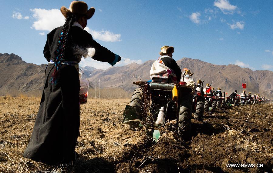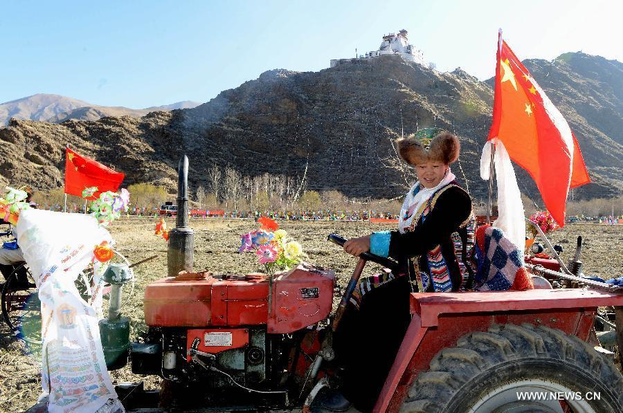 Female tractor driver Qoizong takes part in a spring ploughing ceremony in Zetang County of Shannan Prefecture, southwest China's Tibet Autonomous Region, March 16, 2015. Local farmers celebrated the traditional spring ploughing ceremony on March 16, the first day of spring ploughing in the lunar Tibetan calendar. The grain output of Tibet has witnessed a growth for five year in a row from 900,000 metric tons (tonnes) in 2009 to 985,000 tonnes in 2014. (Photo: Xinhua/Chogo)