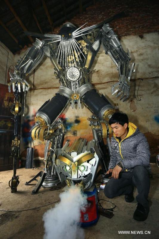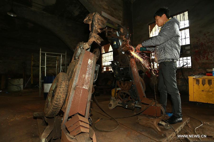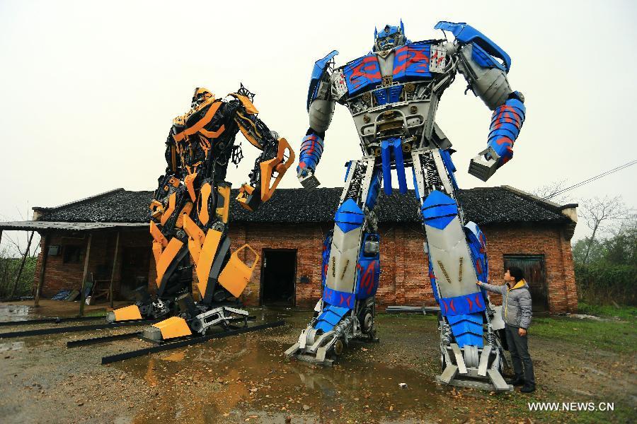 Yu Zhilin (R) and son Yu Lingyun pose for photos in front of giant transformers models in Hengyang County, central China's Hunan Province, March 14, 2015. Yu Zhilin and son Yu Lingyun, farmers of Caotian Village in Hengyang, began to make giant transformers models since 2007. It took them three years to complete the first several models. Yu has earned more than 1 million yuan (160,000 US dollars) this year by selling and renting these models. (Xinhua/Peng Bin)