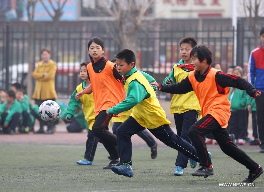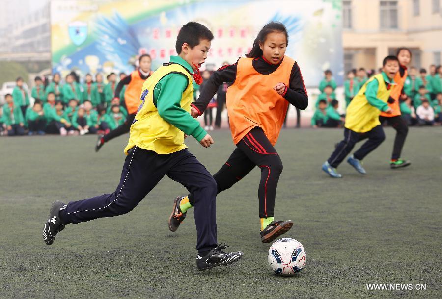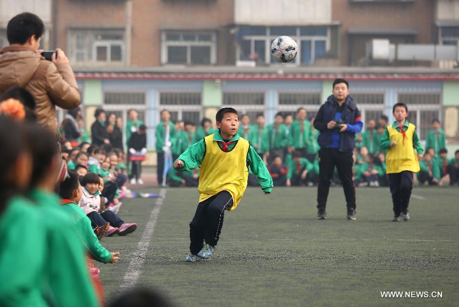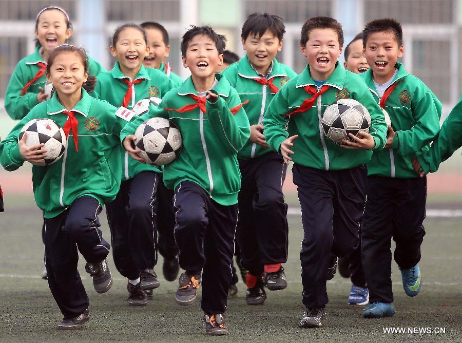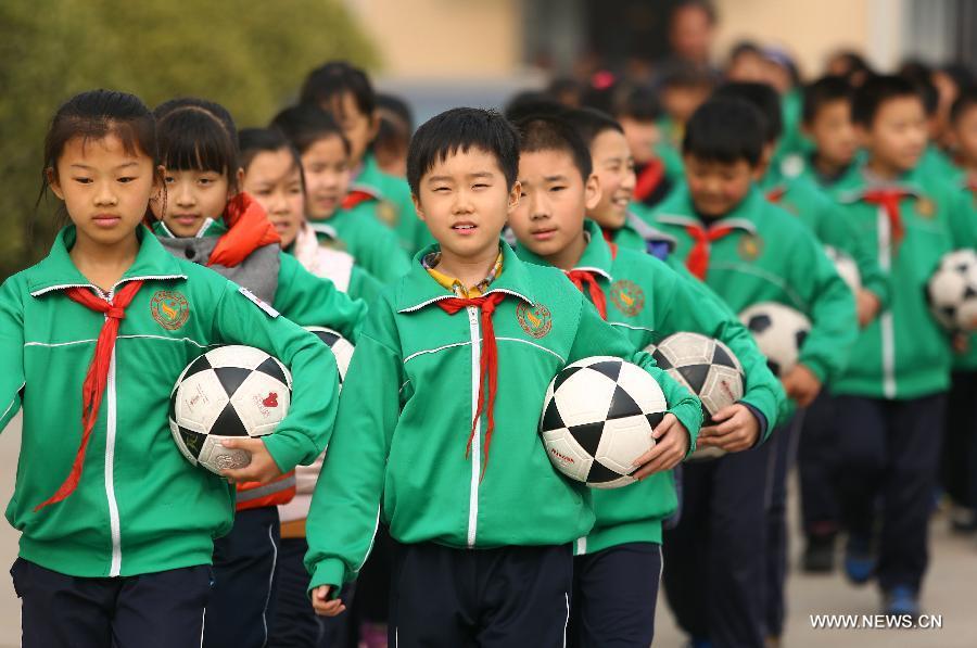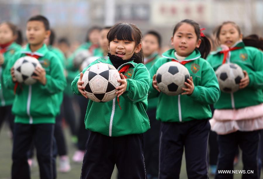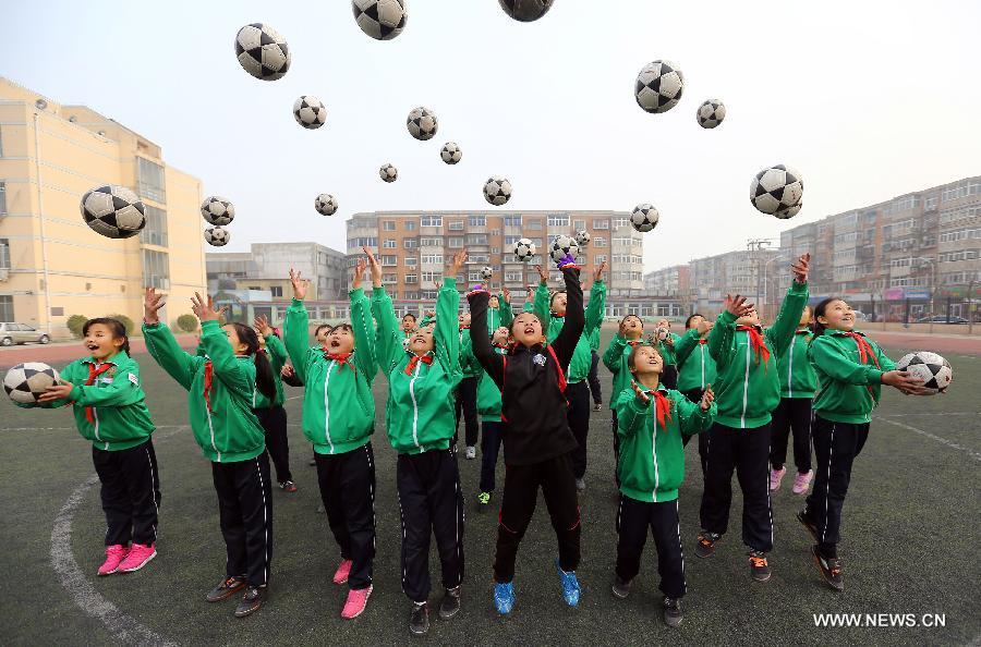 Pupils throw footballs into the air during their school football cultural festival in north China's Tianjin Municipality March 16, 2015. The one-month festival, including football match and painting contest, kicked off on Monday at the Yixingbu No. 3 Primary School in Beichen District of Tianjin. (Photo: Xinhua/Liu Dongyue)
