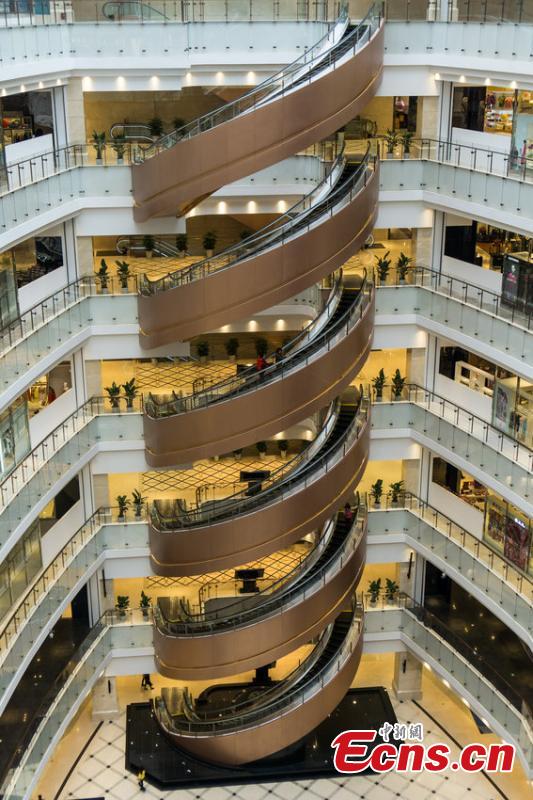 Spiral escalators make a striking impression on visitors in a newly opened shopping mall in Shanghai, March 16, 2015. (Photo/CFP)