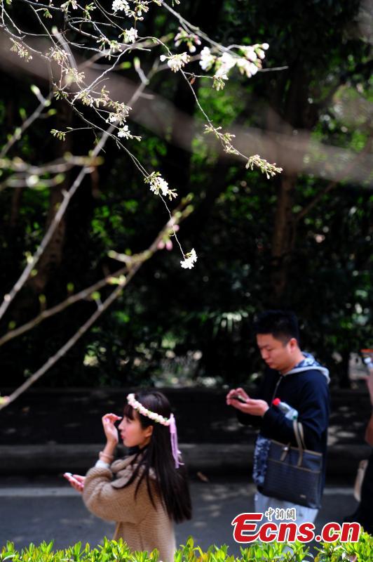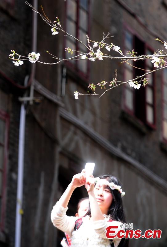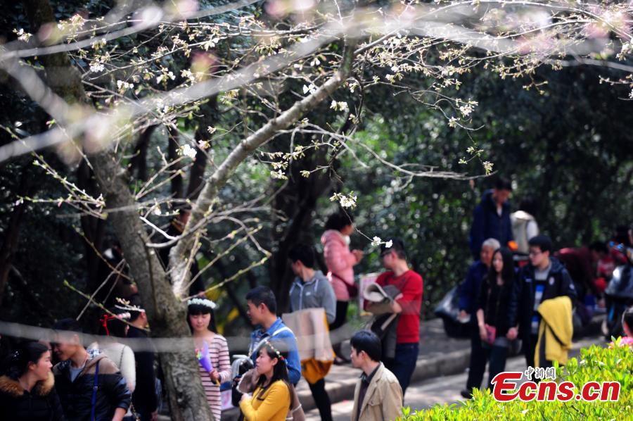 Visitors flock to the Wuhan University campus to view cherry blossom in Wuhan, capital of Central China's Hubei province, March 16, 2015. Though most of cherry trees are not yet in full bloom, crowds of tourists are already visiting to the university. Entrance to the famous cherry blossom garden is controlled during this season and visitors must pay an entry fee. (Photo: China News Service/Zhang Chang)