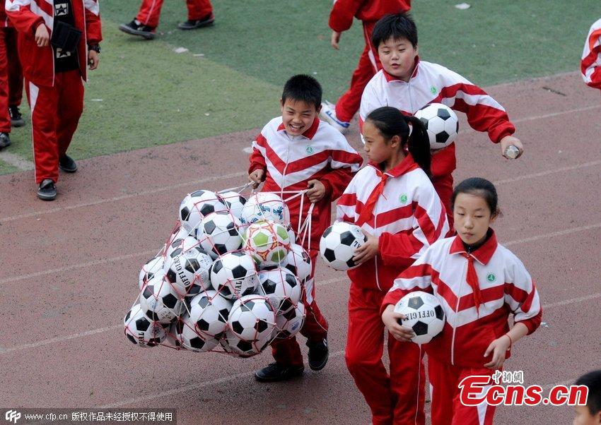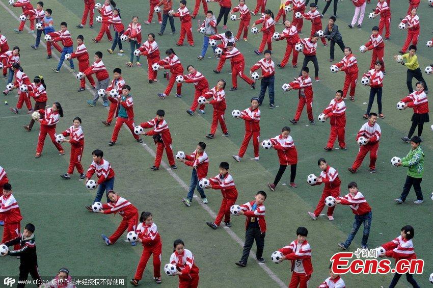 Elementary students carry footballs during an exercise at a school in Luoyang, Central China’s Henan province, March 16, 2015. Local teachers choreographed the exercise sets to increase interest in playing football. China has unveiled a football reform plan to boost the development of the game in the country. (Photo/CFP)