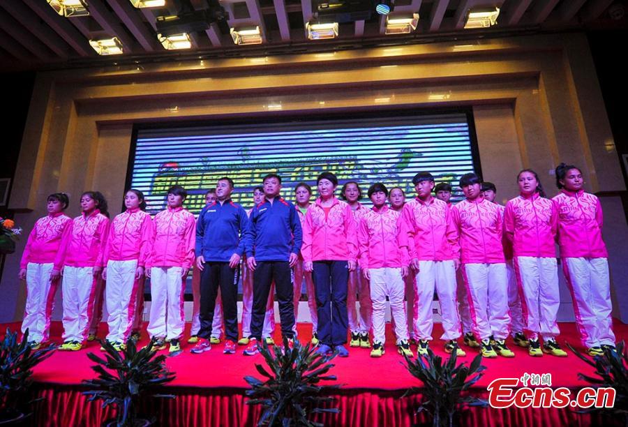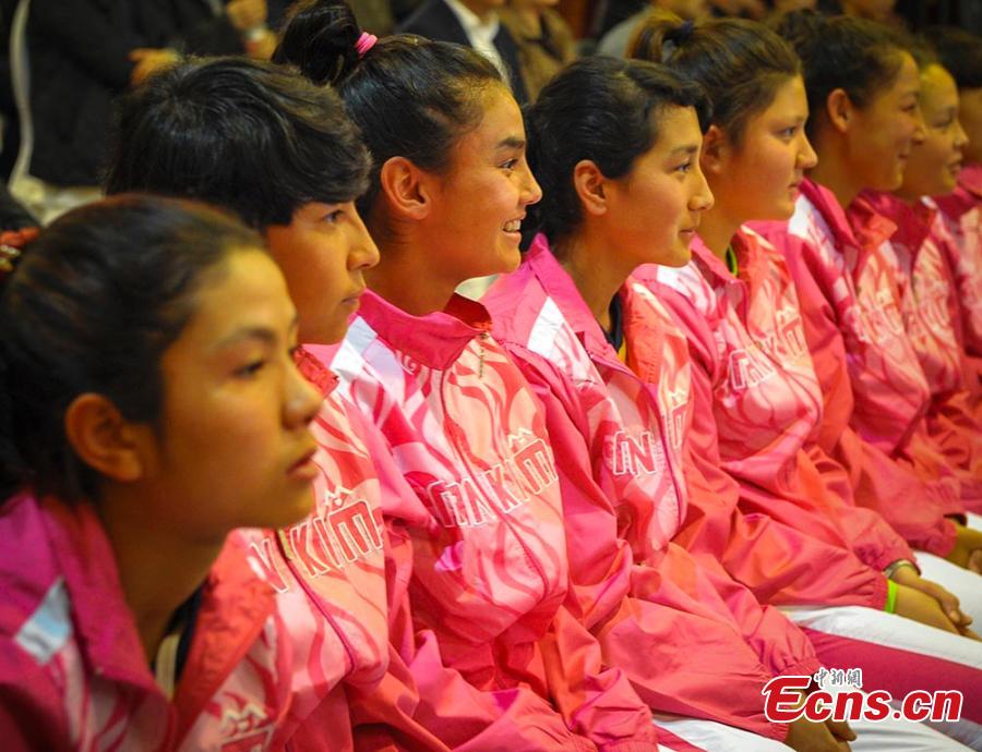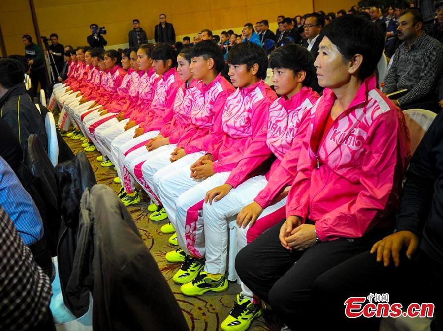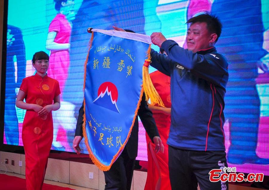 The launch ceremony of Snow Mountain Women’s Football Club is held in Urumqi, capital of Northwest China’s Xinjiang Uygur autonomous region, March 17, 2015. As the first women’s football club in the autonomous region, its members are all students at the Xinjiang Vocational and Technical College of Sports, and come from five ethnic groups: Uygur, Han, Hui, Kazak, and Mongol. The club will take part in qualifying matches in Nanjing for the scheduled First Youth National Games this year. It also aims to compete at the 13th National Games in 2017 and the Chinese Women's Super League in 2020. (Photo: China News Service/Liu Xin)