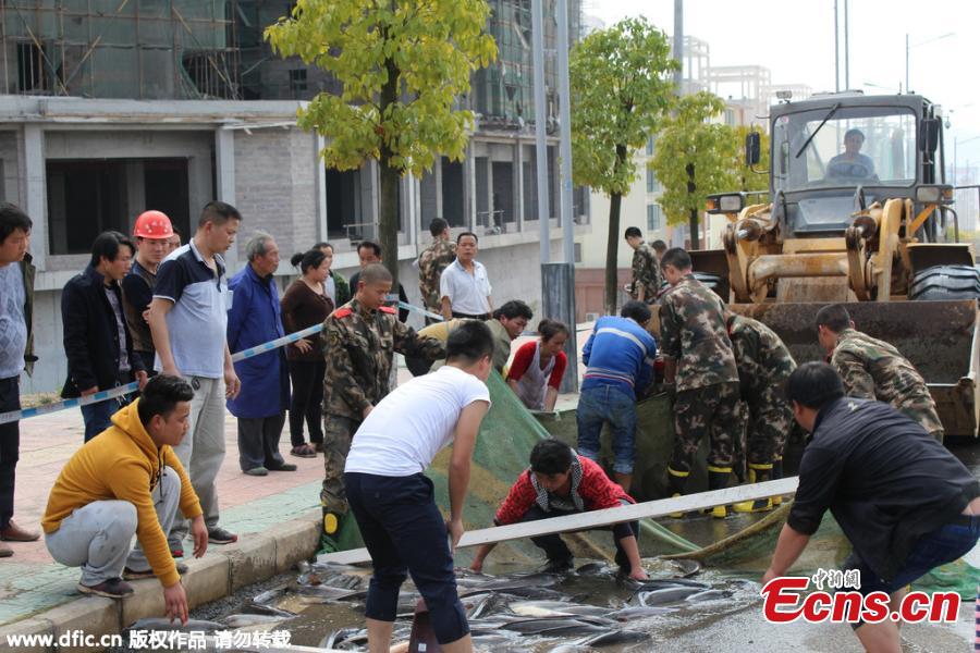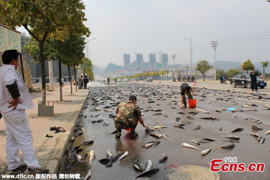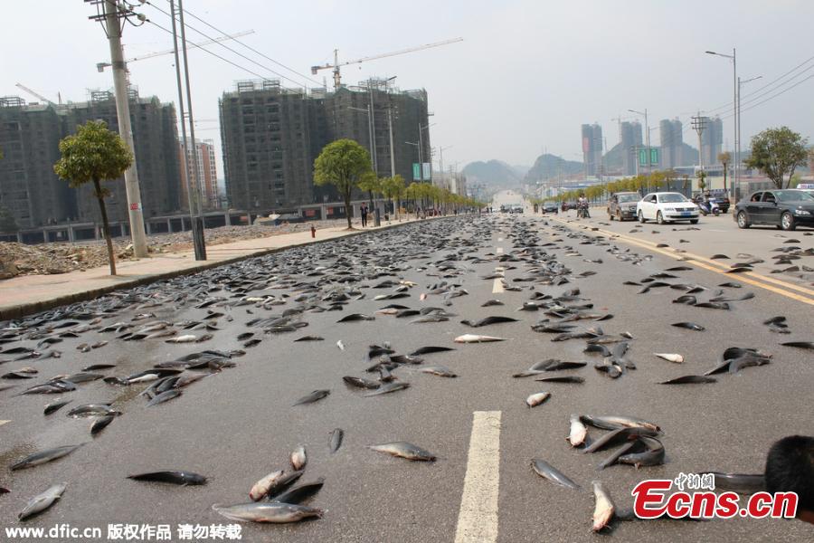 Catfish spill on a road after a truck door opens accidentally in Kaili, Southwest China’s Guizhou province, March 17, 2015. The truck was carrying 6,800 kilograms of catfish. (Photo/IC)