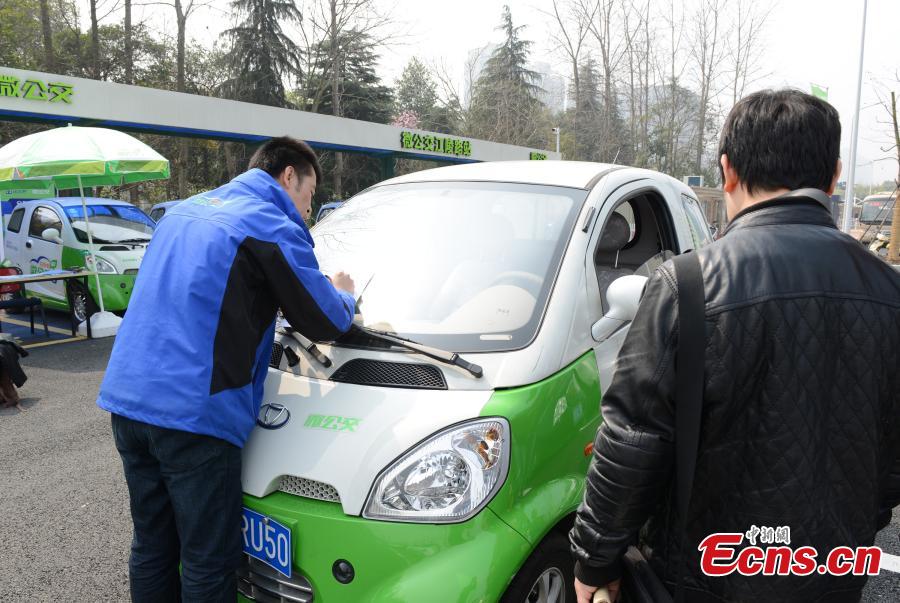 Electric cars, used as "mini buses", are parked near a subway station in Hangzhou, East China’s Zhejiang province, March 17, 2015. The electric cars can travel about 80 kilometers after one charge. Currently, there are two models available, a two-seater and a four-seater. A two-seater costs 20 yuan per hour to rent, and a four-seater costs 25 yuan per hour. In order to rent an electric car, one only needs to present a valid form of ID and a driver license, sign the rental agreement and pay a deposit. The city currently has 9,851 electric cars available to rent. (Photo: China News Service/Li Chenyun)