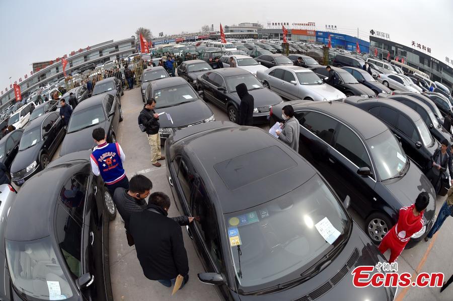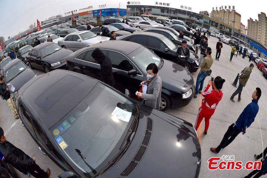 Potential bidders look at government vehicles up for auction in Beijing, March 18, 2015. The central government has impounded 3,184 official vehicles and already auctioned the first batch of 300. According to guidelines, government vehicles can only be used for special services, such as intelligence communication and emergencies, and not regular government affairs. (Photo: China News Service /Jin Shuo)