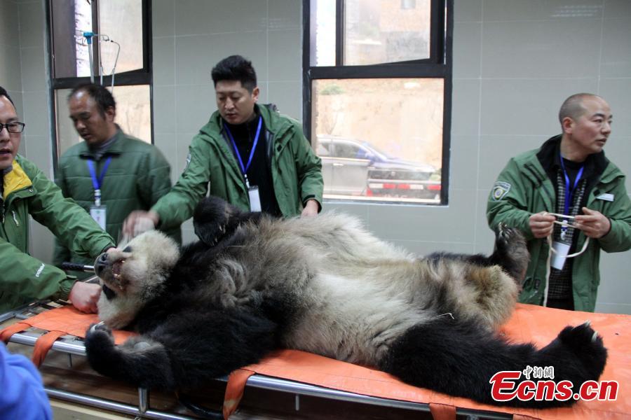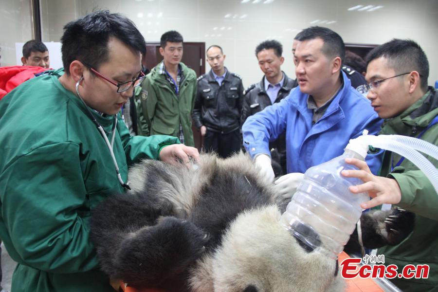 Experts rescue a sick wild female panda, found in Gengda Town, Southwest China's Sichuan province, March 18, 2015. The panda is 10 years old and weighs about 65kg, according to the Wolong National Nature Reserve. Experts at the China Conservation and Research Center for Giant Pandas anaesthetized the panda and sent it to a veterinary hospital for examination. The panda was quarantined and will be sent back to Wolong National Nature Reserve after recovery. (Photo: China News Service/Zhong Xin)
