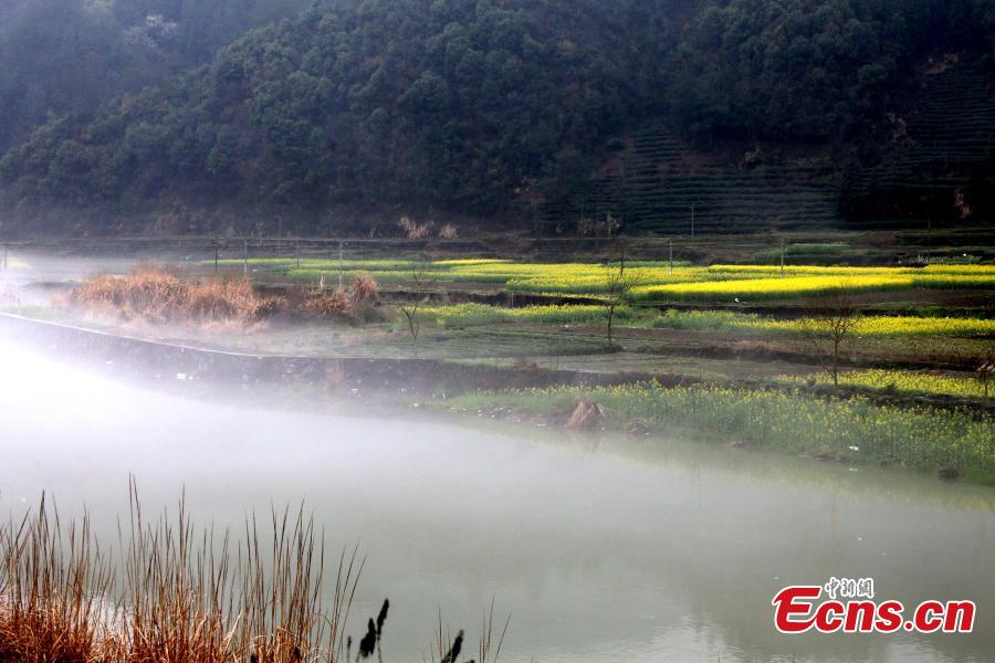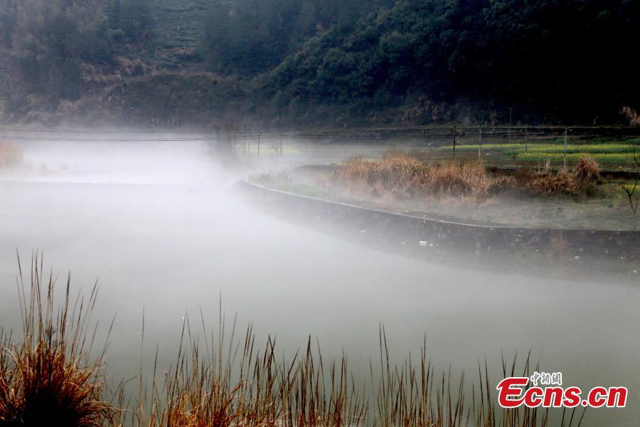 Mist and fog roll past agricultural fields and villages after a shower along the Xin'an River in Huangshan, East China’s Anhui province, March 18, 2015. (Photo: China News Service/Shi Guangde)