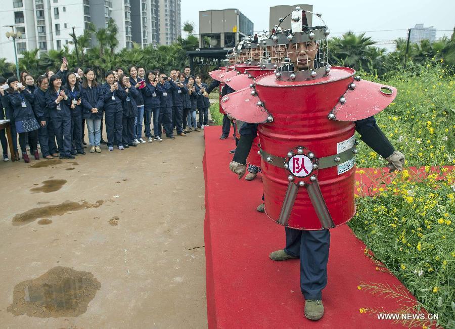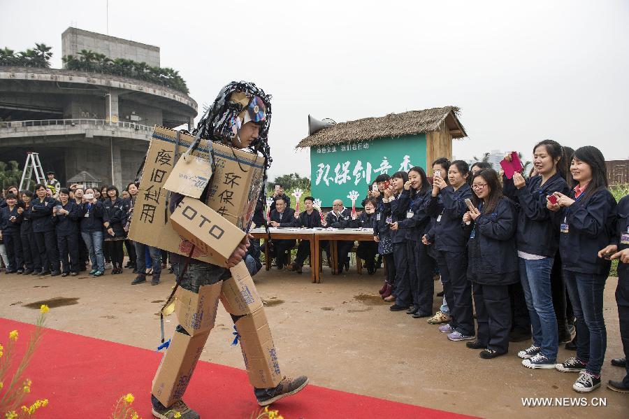 An employee presents a transformer garment made of waste paper boxes during a garment show held by a company in Chongqing, southwest China, March 19, 2015. More than 1,000 employees took part in the show and displayed the creative garments made of waste materials. (Photo: Xinhua/Chen Cheng)