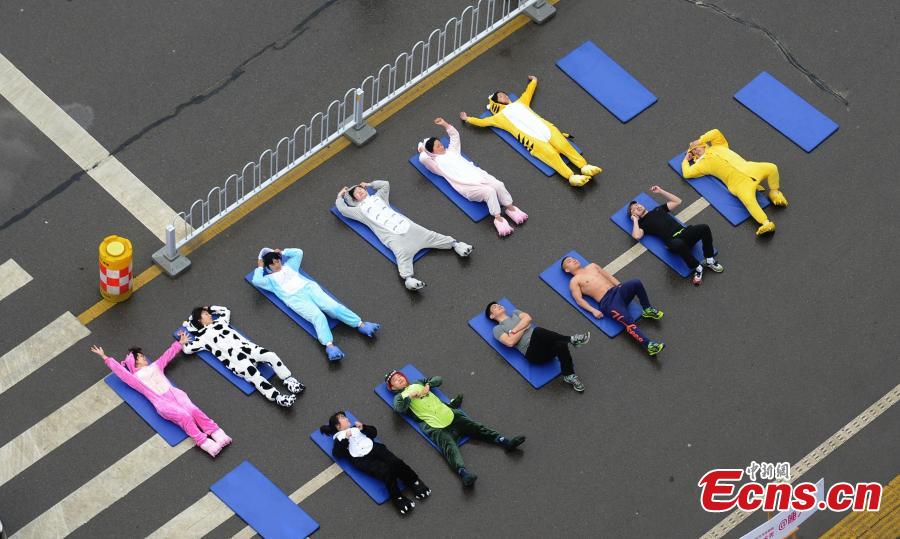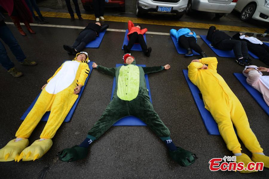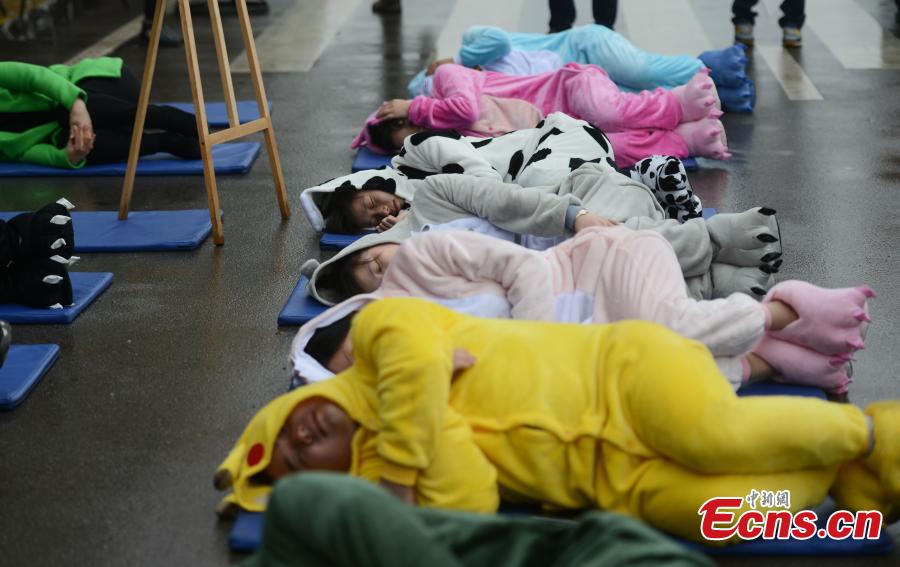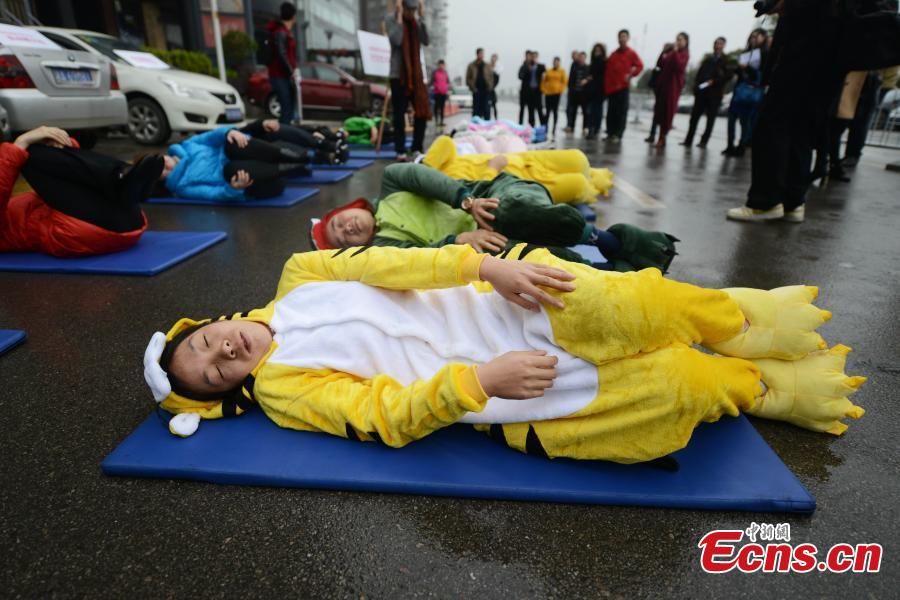 Residents led by hypnotist Tang Tang lie on the ground during an event to mark World Sleep Day and to promote awareness of sleep quality in Changsha, Central China’s Hunan province, March 20, 2015. (Photo: China News Service/Yang Huafeng)