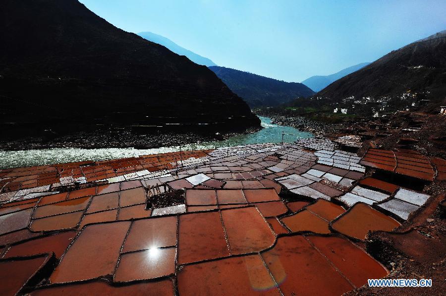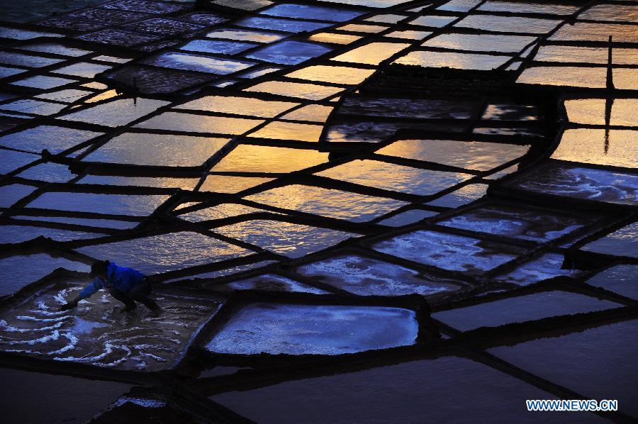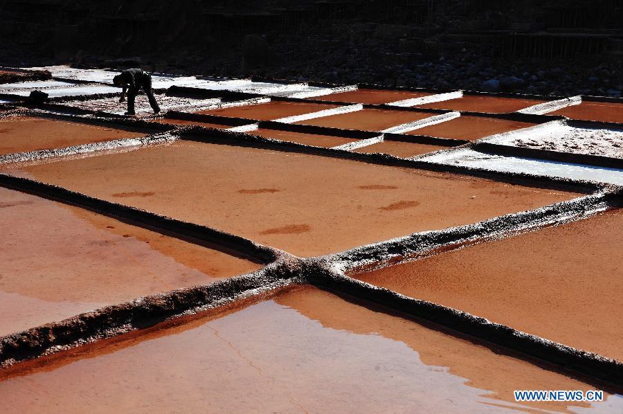 A villager works on salt pans in Markam County, southwest China's Tibet Autonomous Region, March 21, 2015. Markam county, with rich salt resources, has more than 3,000 salt pans to evaporate brine in the sun with an ancestral technique since Tang Dynasty (618-907AD), which is also the oldest method of salt production. This salt evaporation method was listed as one of China's National Intangible Cultural Heritage in 2009.(Photo: Xinhua/Wen Tao)