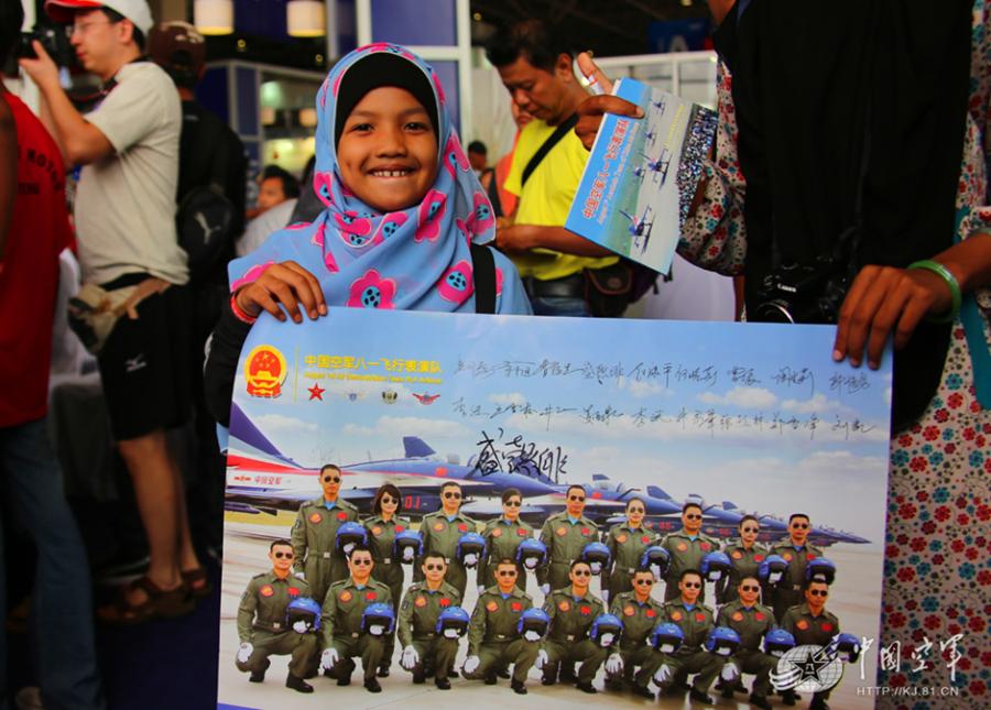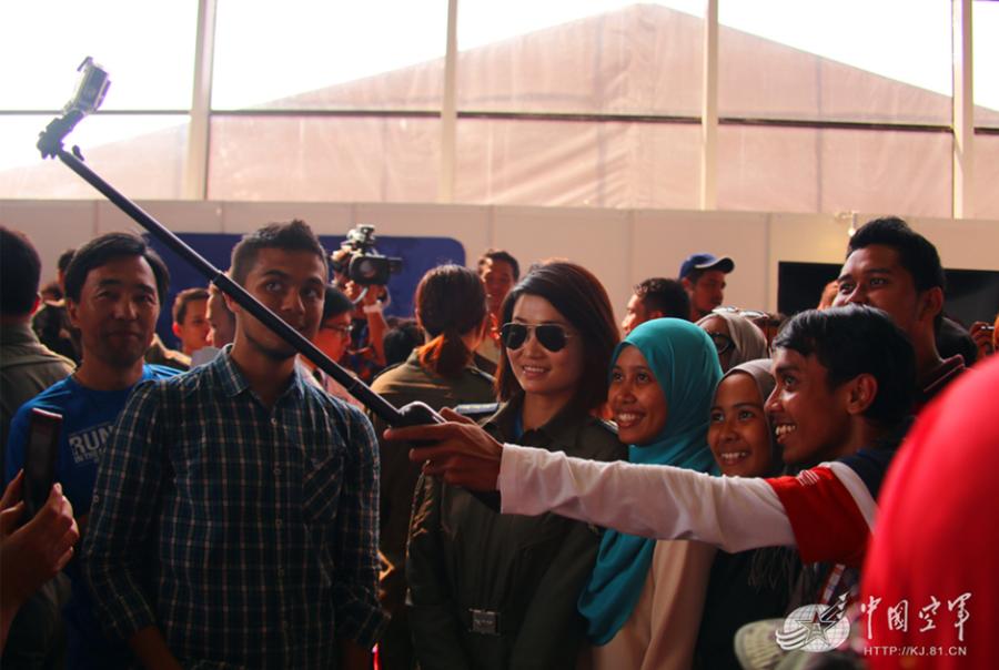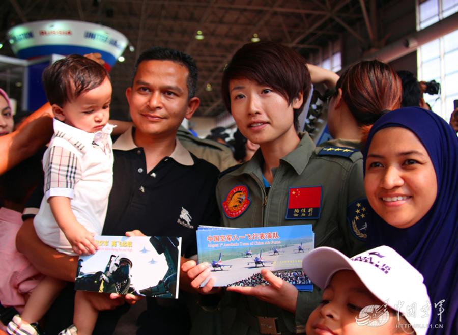 A J-10 fighter jet pilot of the Bayi Aerobatic Team of the Air Force of the Chinese People's Liberation Army (PLAAF) poses with visitors for a picture at the Langkawi International Maritime & Aerospace Exhibition (LIMA) in Malaysia. Pilots Yu Xu, Tao Jiali, Sheng Yifei and He Xiaoli, members of the PLA Air Force acrobatic team performed at LIMA in the J-10 fighter jets. The stunt show is the first time China's female fighter pilots have performed abroad. (Photo: China News Service/Li Xuan)