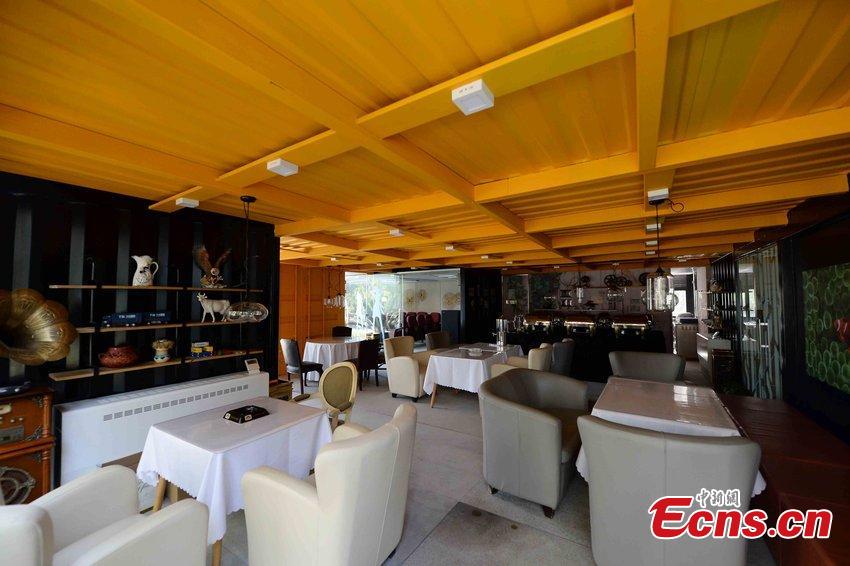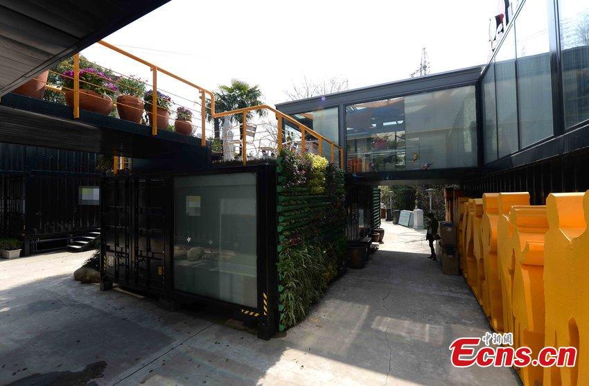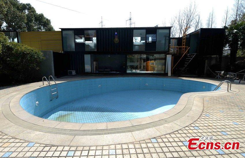 A building complex made from containers is seen at a construction site in Songjiang district, Shanghai municipality, March 22, 2015. The two-story building contains an office, a capsule-like bedroom, a swimming pool, a restaurant and a terrace. The construction cost about one million yuan ($160,000), sources said. (Photo/CFP)