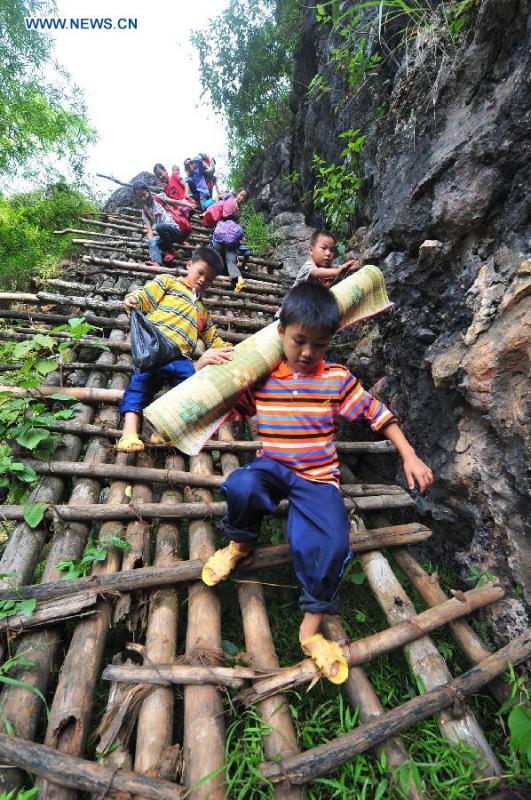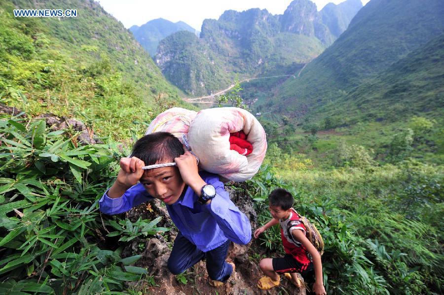 A pupil carrying his quilt walks on a mountain road in Nongding Village of Bansheng County, south China's Guangxi Zhuang Autonomous Region, Sept. 3, 2012. Nongyong Primary School was built in 1964. It is located in Bansheng County, a rural area of karst topography in Guangxi. Its initial school building consists of 12 one-storey houses. In 1990s, a two-storey teaching building and rough dormitory were built. There are about 250 students from all 22 villages of Nongyong. Every Monday, most of them have to walk over hills on their way to the school. In weekdays, about 30 children share seven or eight beds in a small room less than 20 square meters. Their main source of drinking water is recycle of rainwater. However, rough teaching and living facilities did not change their deep desire for knowledge. Investments and donations across the country brought them new dormitory, canteen, bathroom and library. It offered those children a better condition of learning. (Photo: Xinhua/Huang Xiaobang)