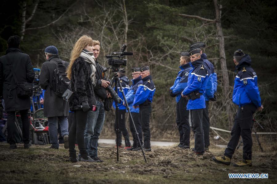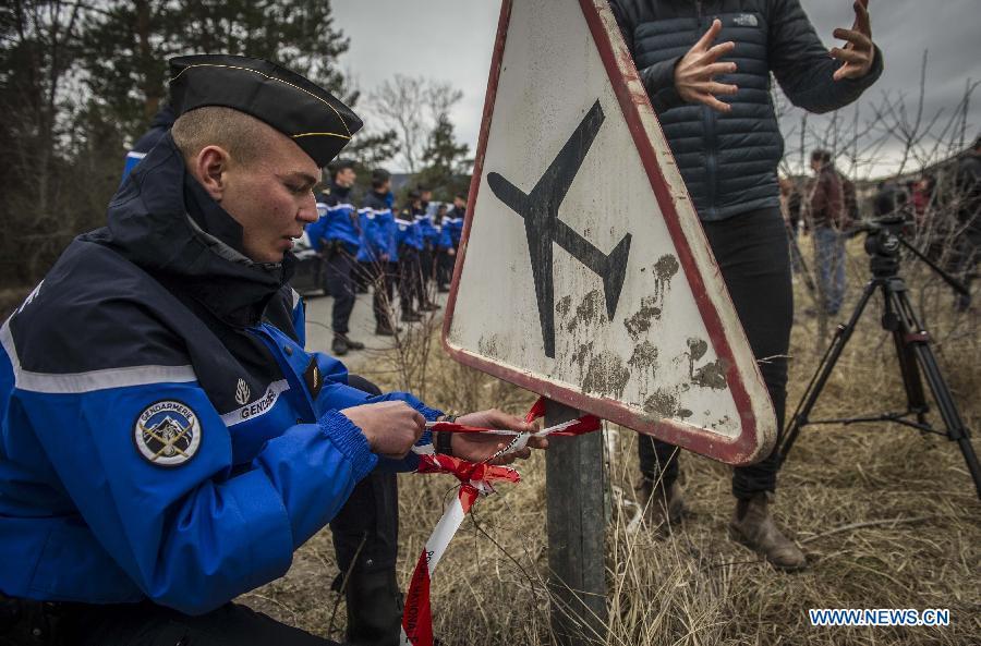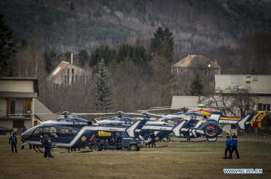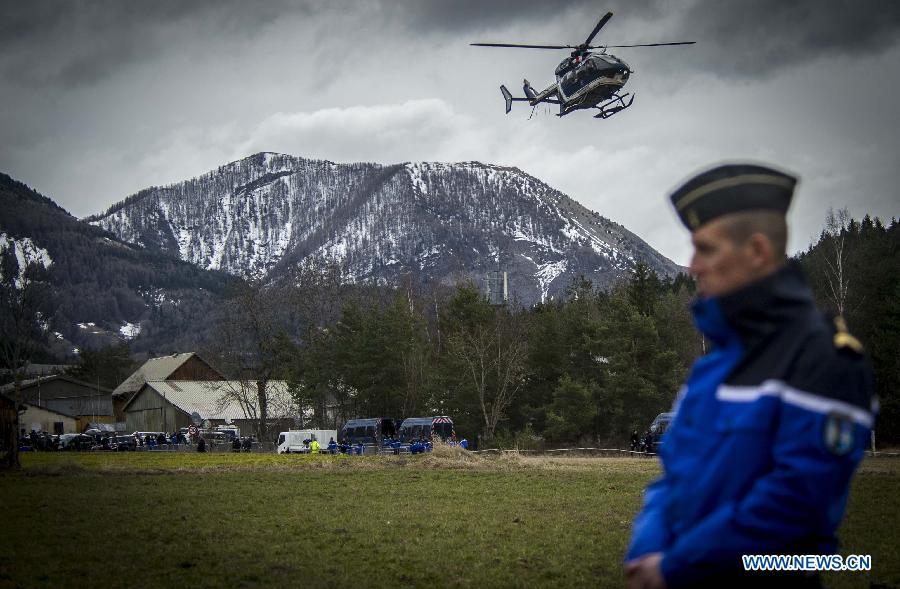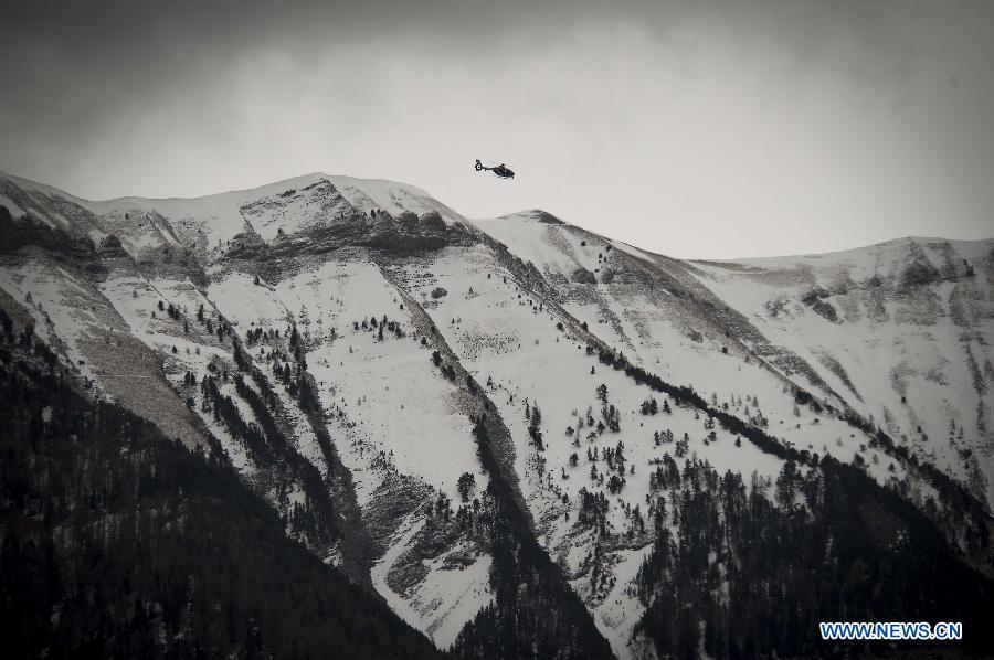 A rescue helicopter flies to the crash site of Germanwings Airbus A320 plane in the Alps in southern France, March 25, 2015. French gendarmes late Tuesday found one of the two black boxes of the German passenger plane that crashed in southern France with 150 people on board, while a joint international probe into the cause of the accident is under way. (Photo: Xinhua/Chen Xiaowei)