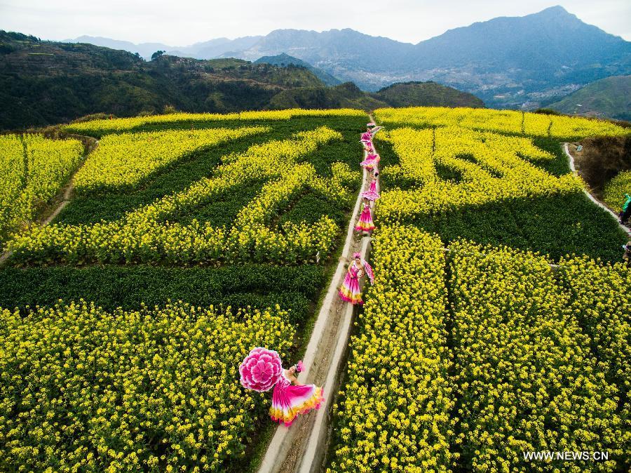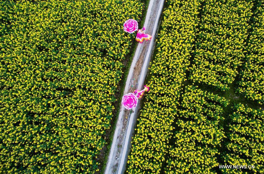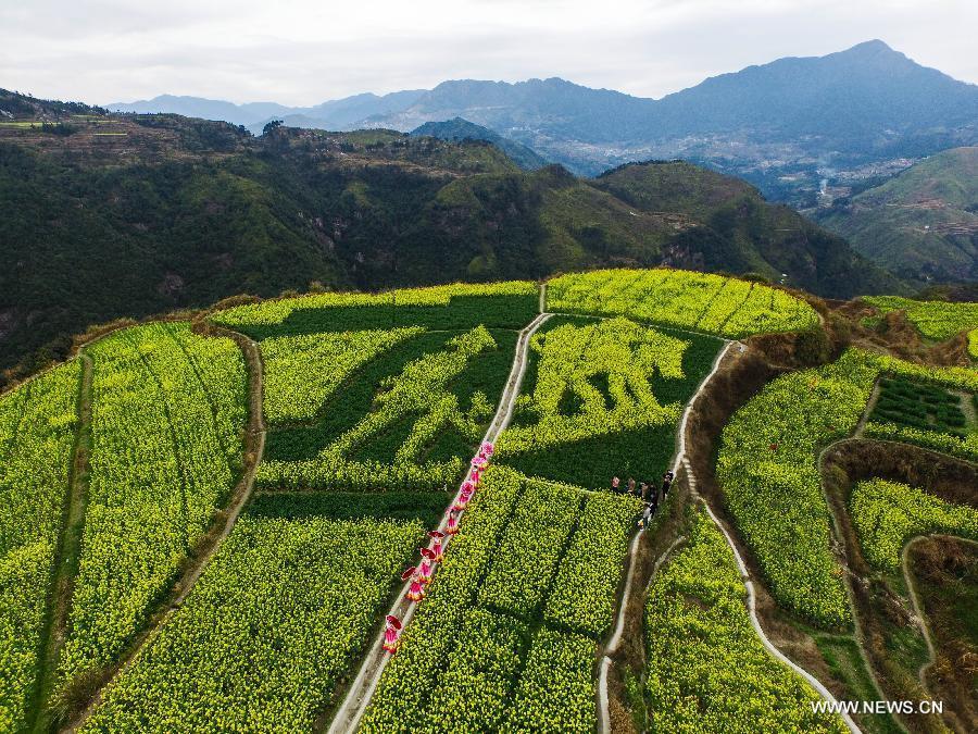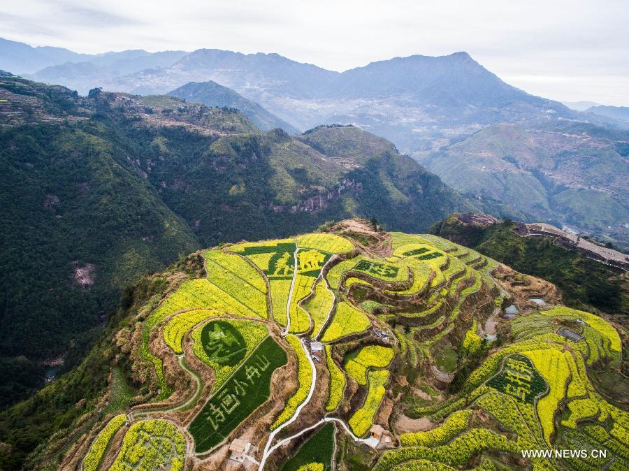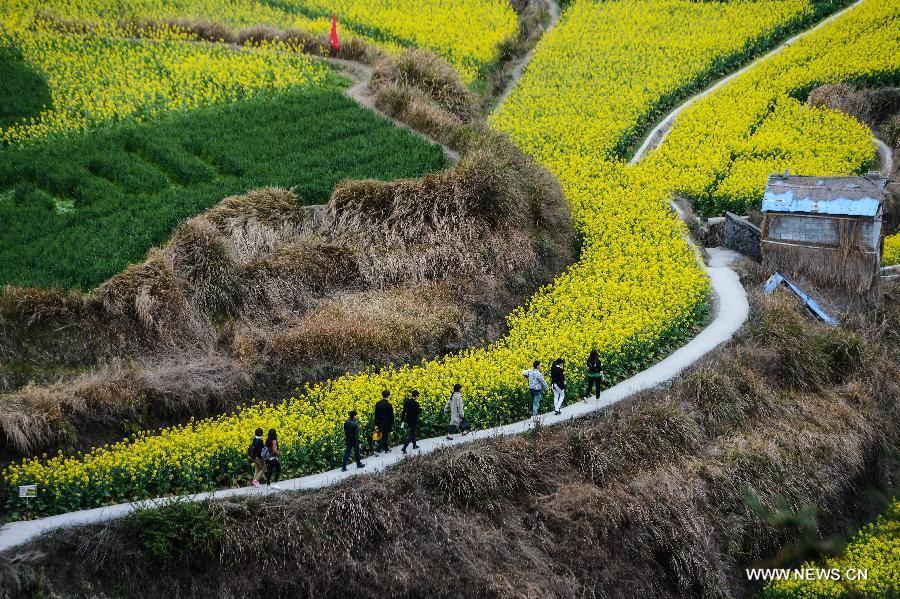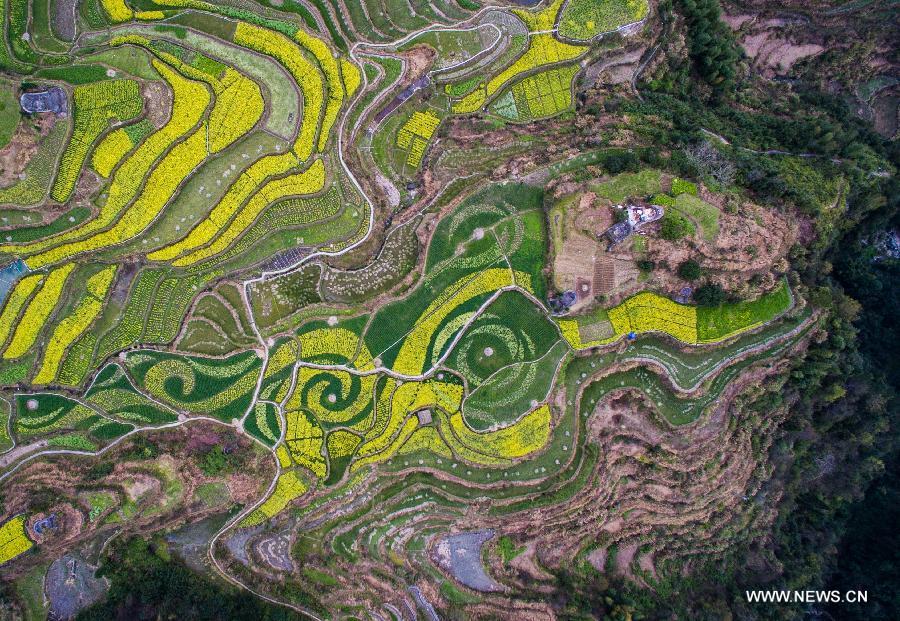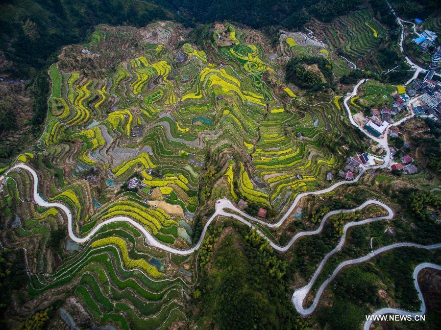 Photo taken on March 26, 2015 shows terrace with a design of cole flowers in Xiaozhoushan Township of Qingtian County, east China's Zhejiang province. By designing its terrace of a large tract of more than 4,000 mu (about 267 hectares), Xiaozhoushan has attracted many visitors and developed its local economy since 2013. (Photo: Xinhua/Xu Yu)