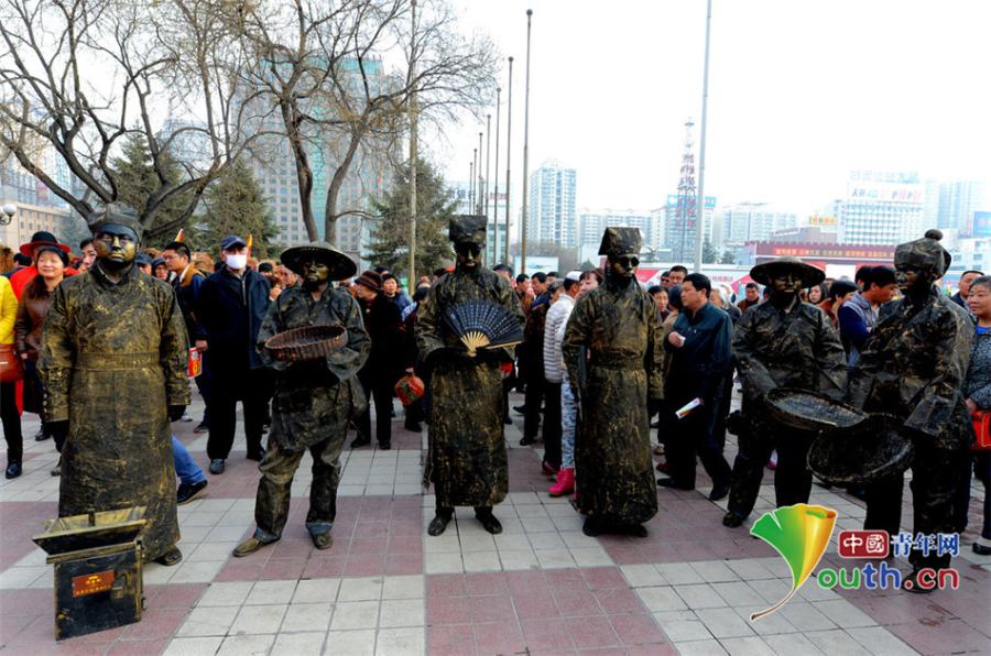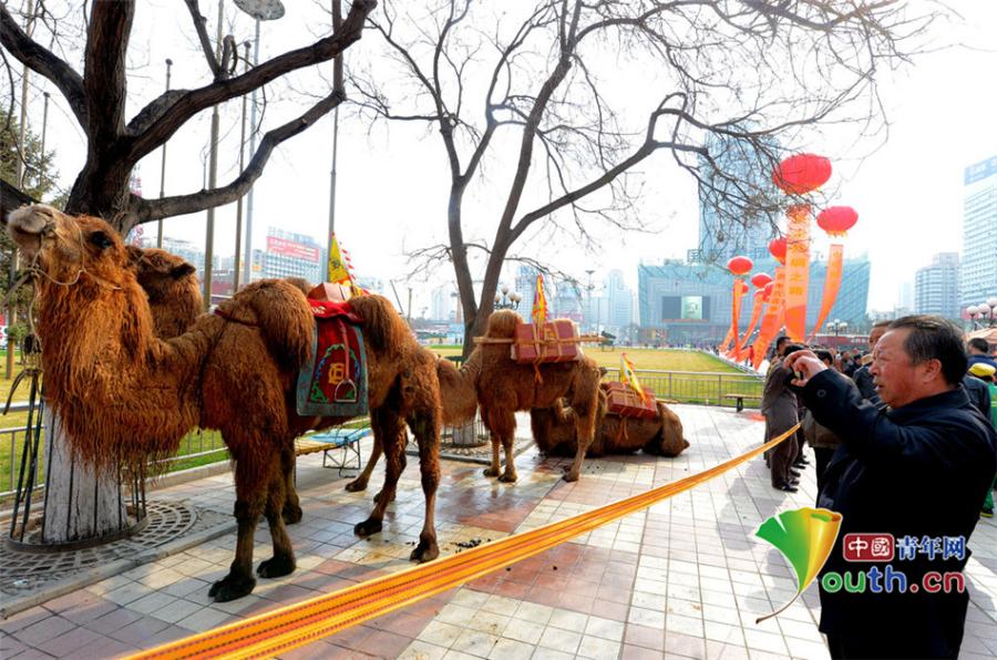A caravan makes debut in the Dongfanghong square of Lanzhou in west China's Gansu province, March 24, 2015. A trade caravan consisted of 136 camels, 8 horses and 100 people travels along the ancient "Silk Road" and displays traditional culture of tea and silk. (Photo/Youth.cn)