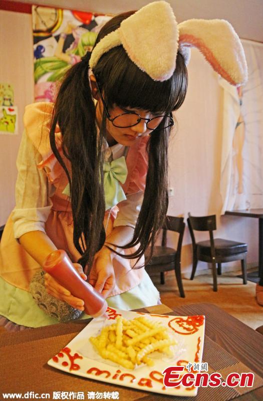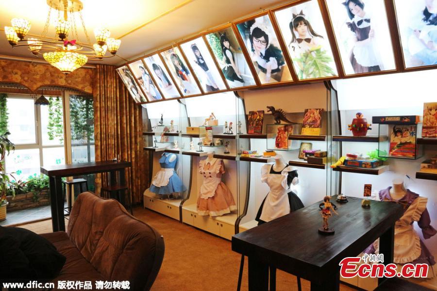 Waitresses, dressed up in maid uniforms, serve at a cartoon-themed cafe at a shopping mall in Zhengzhou, Central China’s Henan province, March 26, 2015. The cafe, decorated with cartoon posters and with models inside, is owned by a photographer and cartoon fan, who was born in the 1980s. (Photo/IC)