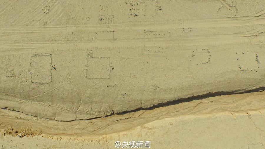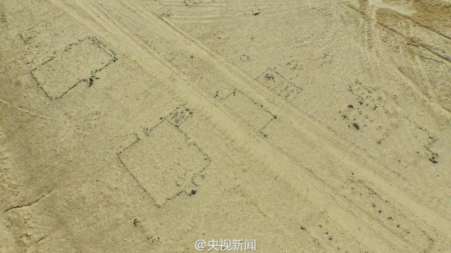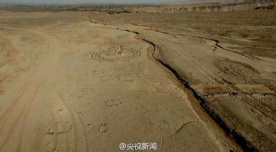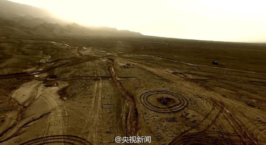 Stone circles in the Gobi desert, one km north of Flaming Mountains, in Northwest China’s Xinjiang Uygur autonomous region. About 200 stone circles of varying sizes and styles have been found in a 20,000-square-meter area. Experts speculate the circles were sacrificial sites. (Photo/CCTV Weibo)