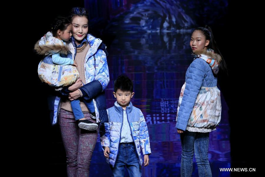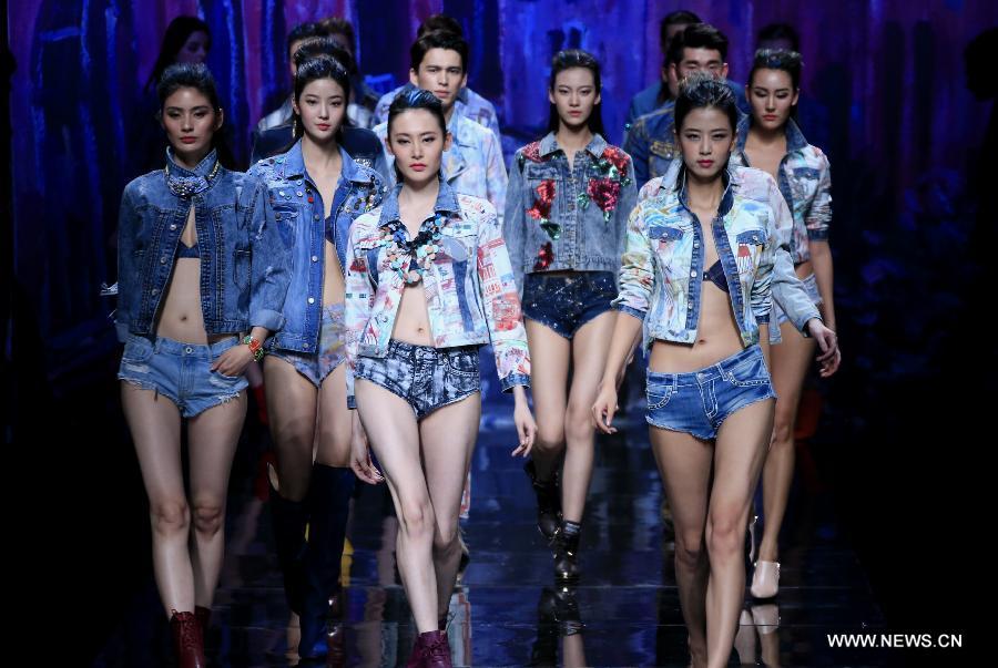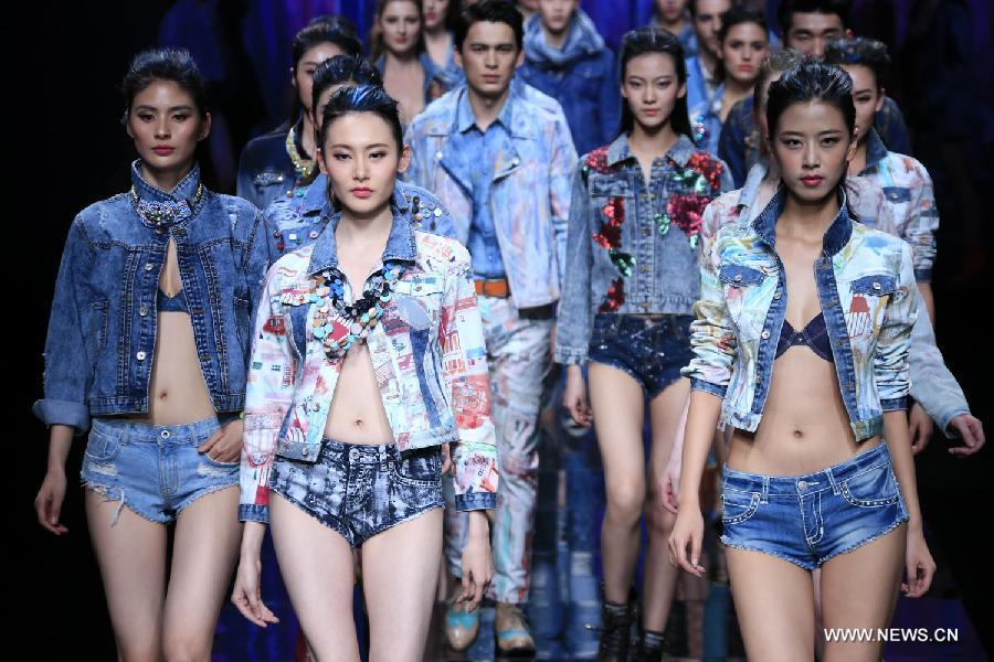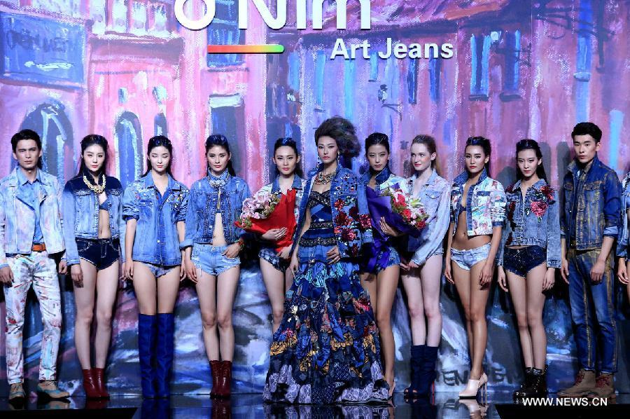 Models present creations of D'Nim art jeans by designer Chen Wen during the China Fashion Week Autumn/Winter 2015/2016 in Beijing, capital of China, March 27, 2015. (Xinhua/Li Mingfang)