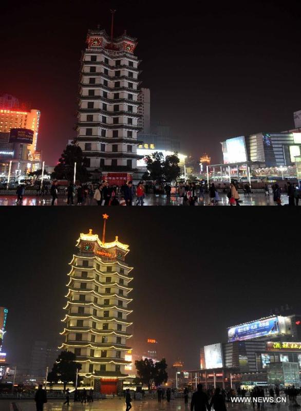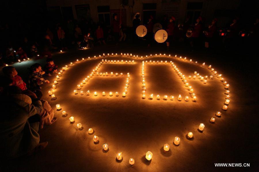 Villagers of the Tangjiazhuang Village form the shape of "60" with candles during the annual Earth Hour campaign in Xingtai, north China's Hebei Province, March 28, 2015. (Xinhua/Zhu Xudong)