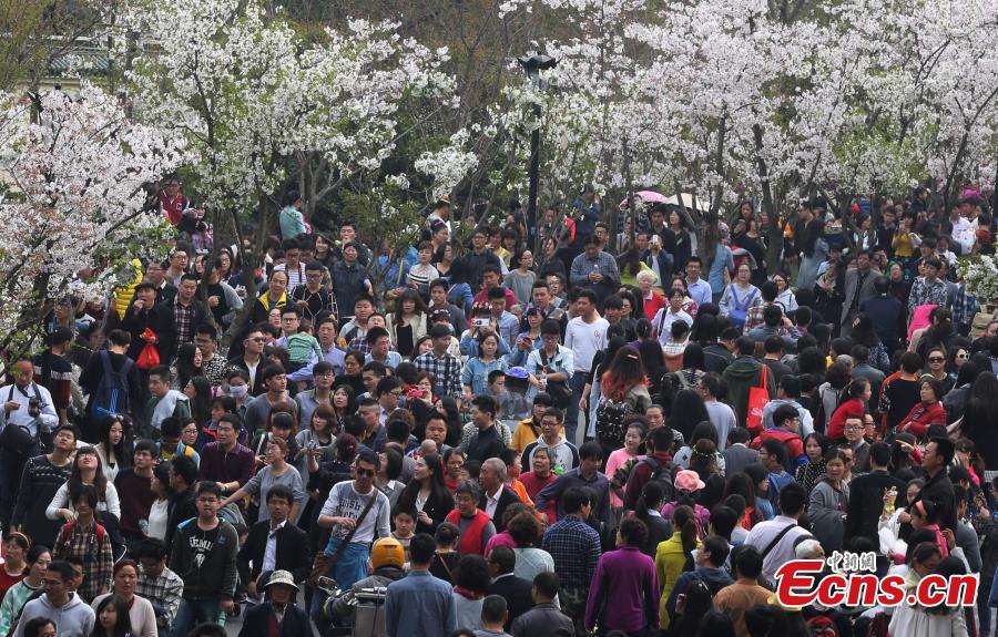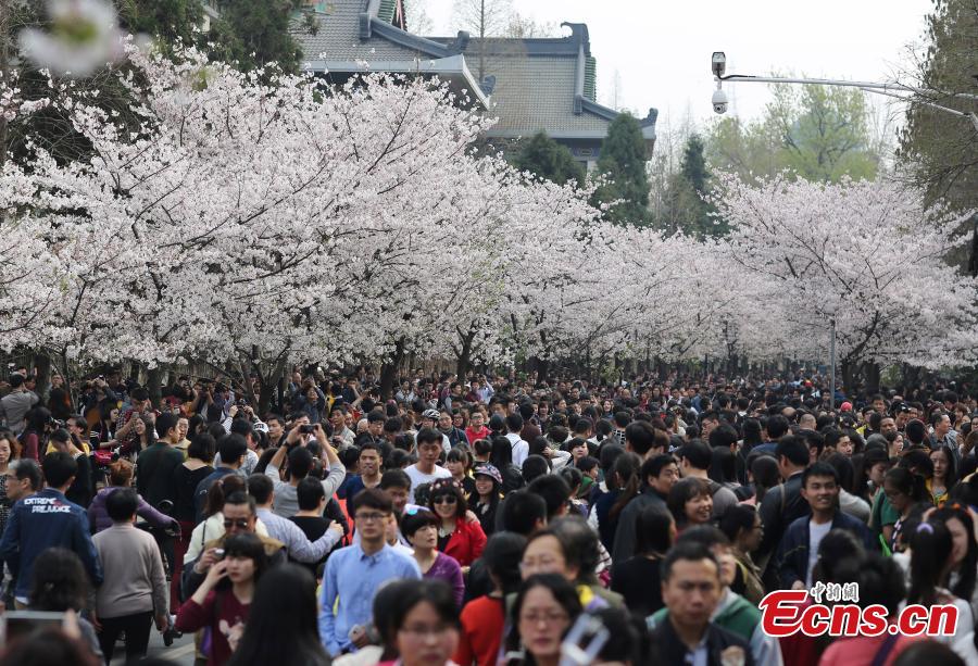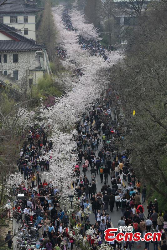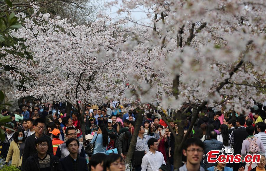 Tourists view cherry blossoms on the Jiming Road leading to the Jiming Temple in Nanjing, capital of East China's Jiangsu province, March 29, 2015. The road is one of the best places to view cherry blossoms, usually at the fullest in March. The temple, which literally means "rooster crowing", is a renowned Buddhist temple and also one of the oldest temples in Nanjing. (Photo: China News Service/Yang Bo)