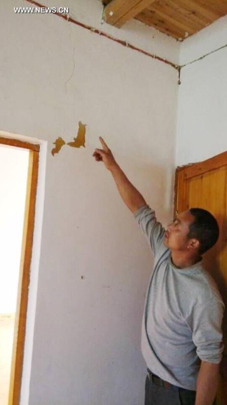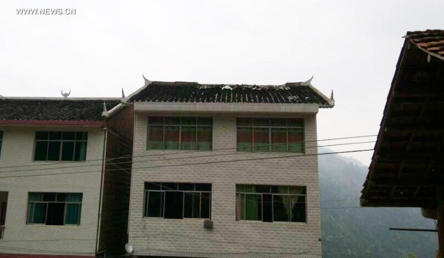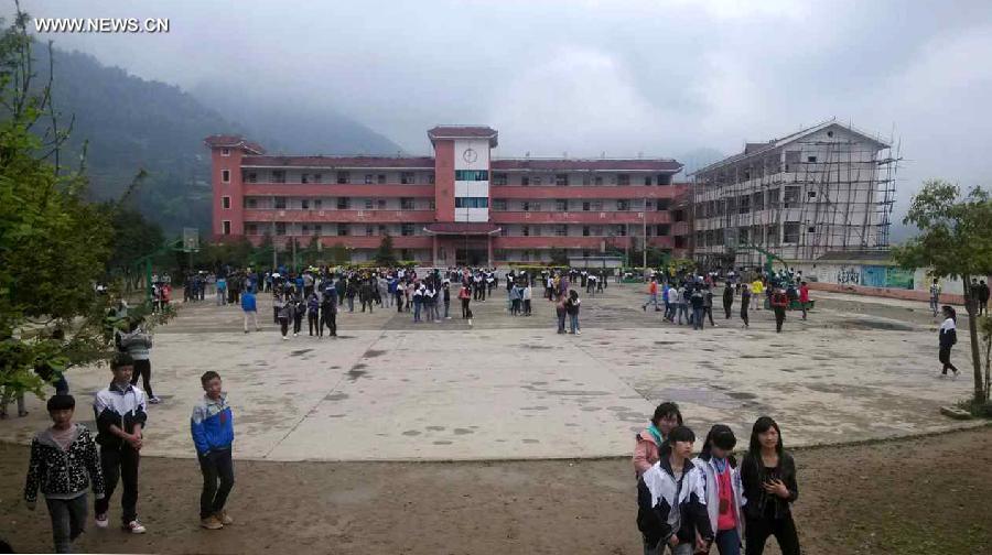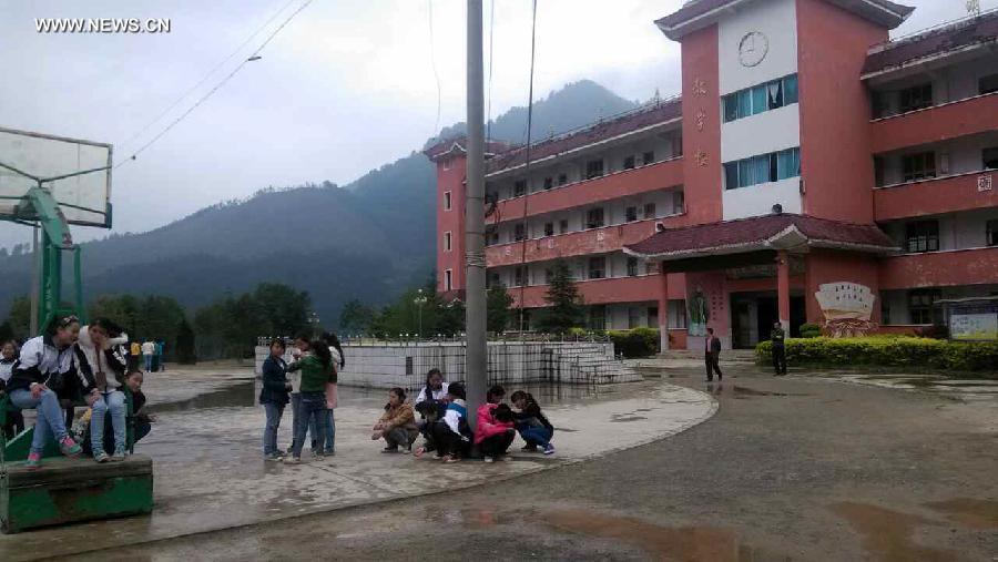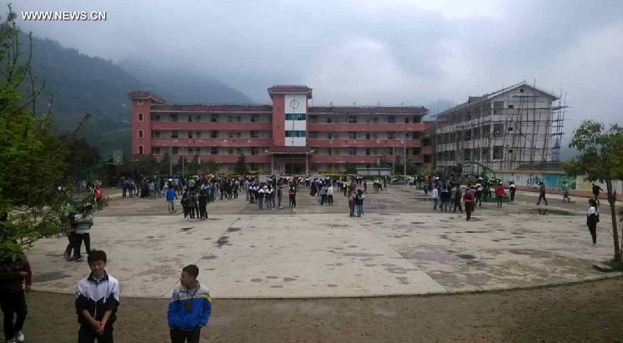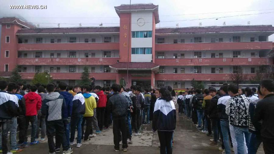 People run off stairs at a building in Congjiang County, close to Jianhe County, southwest China's Guizhou province, March 30, 2015. A 5.5-magnitude quake struck Jianhe county in Guizhou province Monday, according to the China Earthquake Networks Center. (Xinhua/Liang Guangyuan)