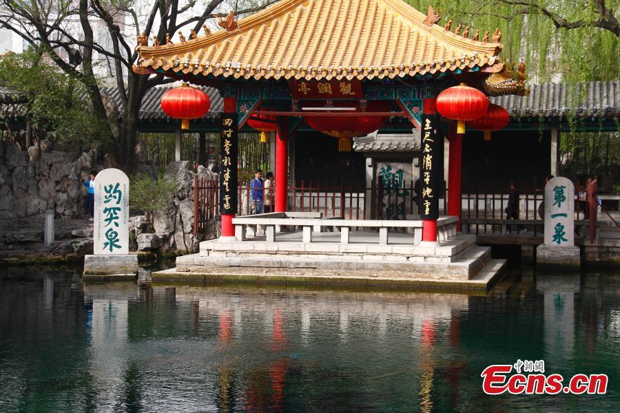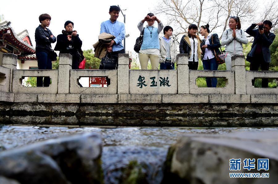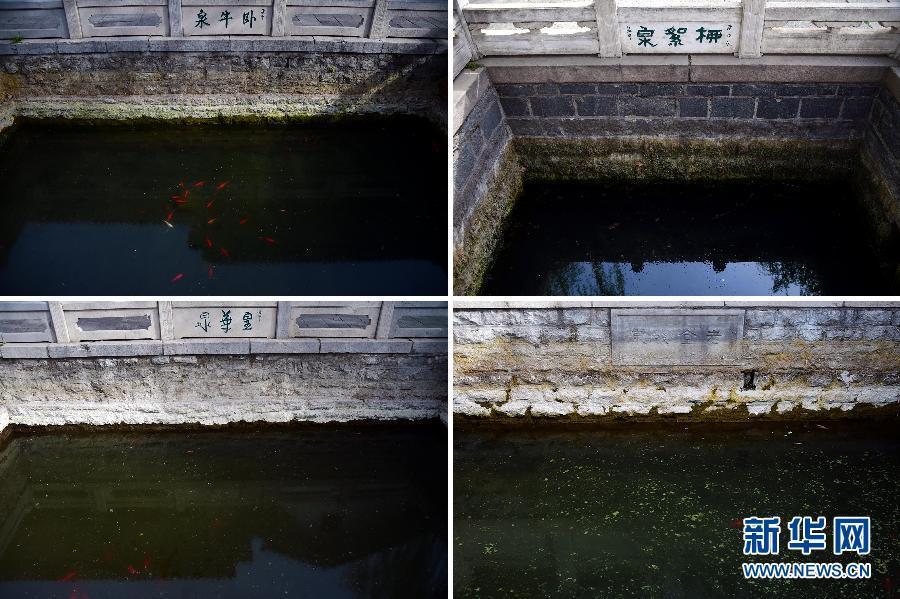 Visitors look at a spring with less water flow in Jinan, East China’s Shandong province, March 29, 2015. Seventeen of the 72 famous artesian springs have stopped discharging water due to the less rainfall and lingering drought. The underground water level of the Baotu Spring, the most renown one and also named” "Number One Spring under the Heaven", has dropped to its alarm level of 27.60 meters over the past eight days. (Photo: China News Service/Zhang Qingmin)