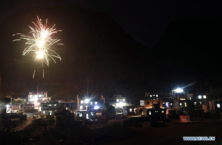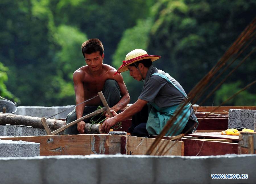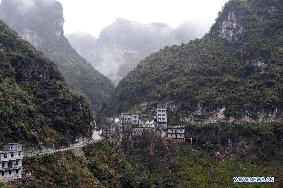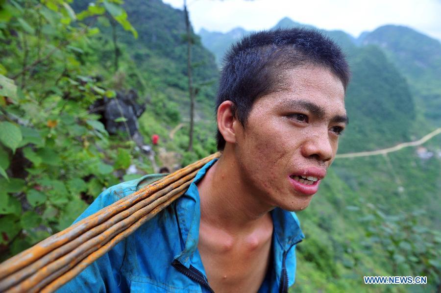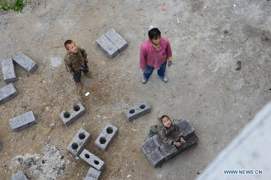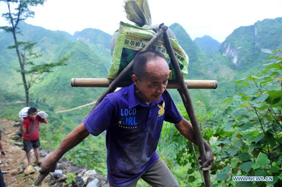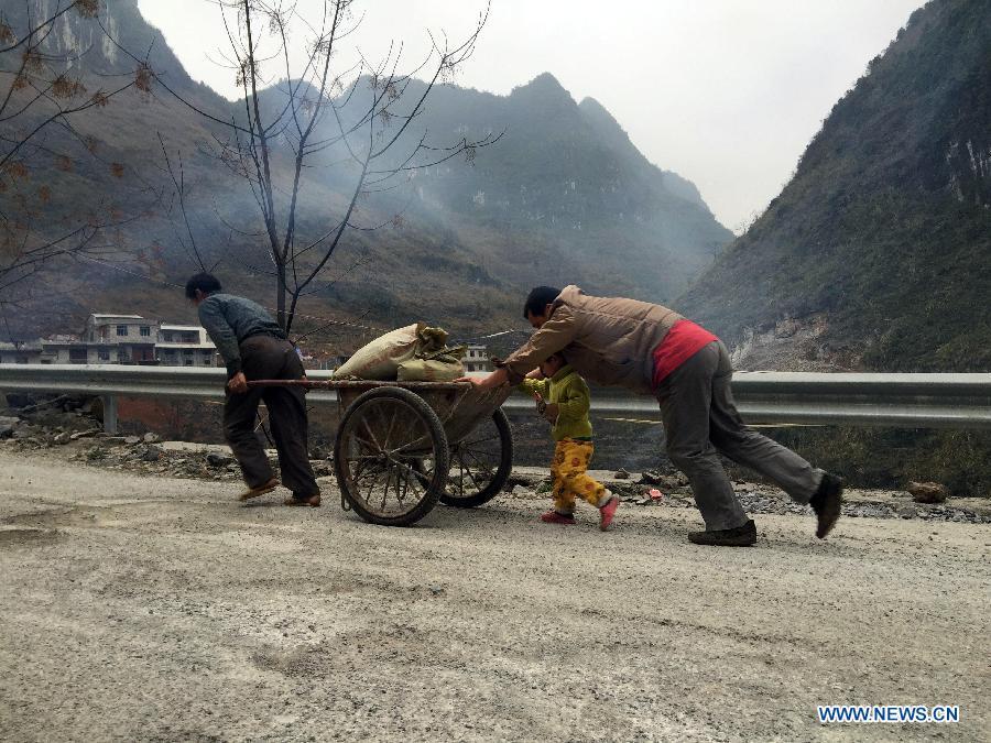 The 38-year-old Lan Xiuying (R, upper) waits to lift bricks in Nongding Village of Bansheng Township, southwest China's Guangxi Zhuang Autonomous Region, Feb. 28, 2015. Because of the lack of flatland, most of the families in the western mountainous areas of Dahua build their houses on hills. In Qibainong and Bansheng counties of Dahua, people of the Miao ethnic group have lived in the mountains for about a thousand years. They count on planting corns for their livelihood. Three-story stilted building is the traditional architecture style in the two counties. People raise livestock on the lower floor, reside on the middle floor and store grain on the top floor. They have to face a big fire hazard due to the thatched or shingle structure of their houses. Since the implementation of the reform and opening-up policy in 1978, some young people working in modern cities have brought a new building concept to the remote villages. People started to build houses on the roadside. They overcame the inconvenience of transporting building materials. The average cost of such houses are between 100,000 and 300,000 yuan (between 16,000 and 48,000 U.S. dollars). Salary savings of young people, government subsidies and lending from relatives and friends are three main sources of financing. In recent years, with the implementation of rural dilapidated house transforming plan in Guangxi, more and more villagers have moved into their new houses. (Xinhua/Huang Xiaobang)