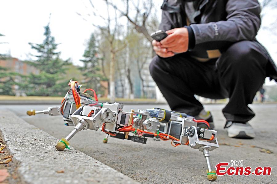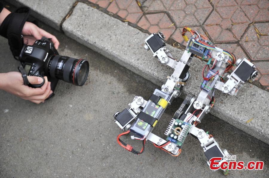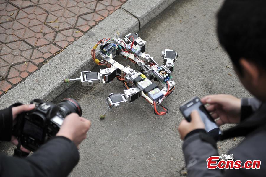 A student operates a robot with his cell phone to cross a barrier at the Tianjin University in North China’s Tianjin municipality, April 1, 2015. The multi-foot robot, the third generation developed by students of the university, can fold itself up and crawl away like a crab in different ground conditions, allowing a wider range of applications in aerospace, geological survey, and relief work. (Photo: China News Service/Tong Yu)