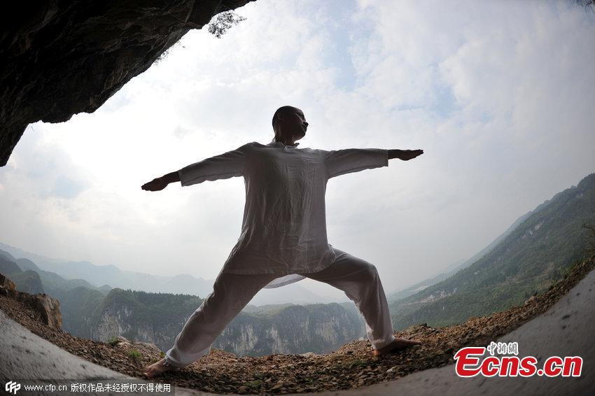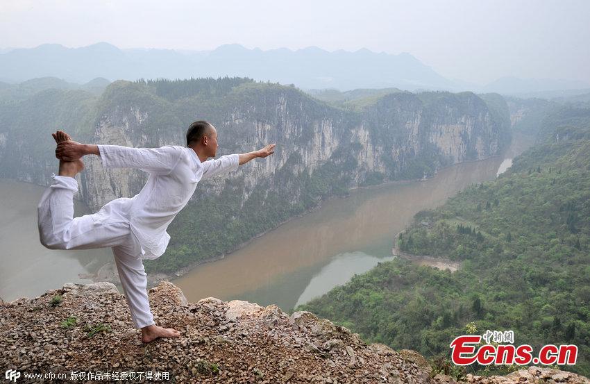 A Yoga player performs at ease on a cliff close to the Maoyan River in Zhangjiajie, Central China’s Hunan province, March 31, 2015. (Photo/CFP)