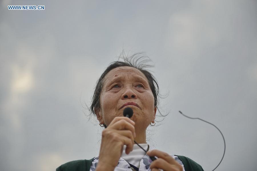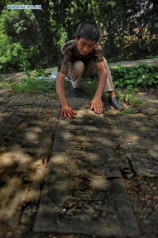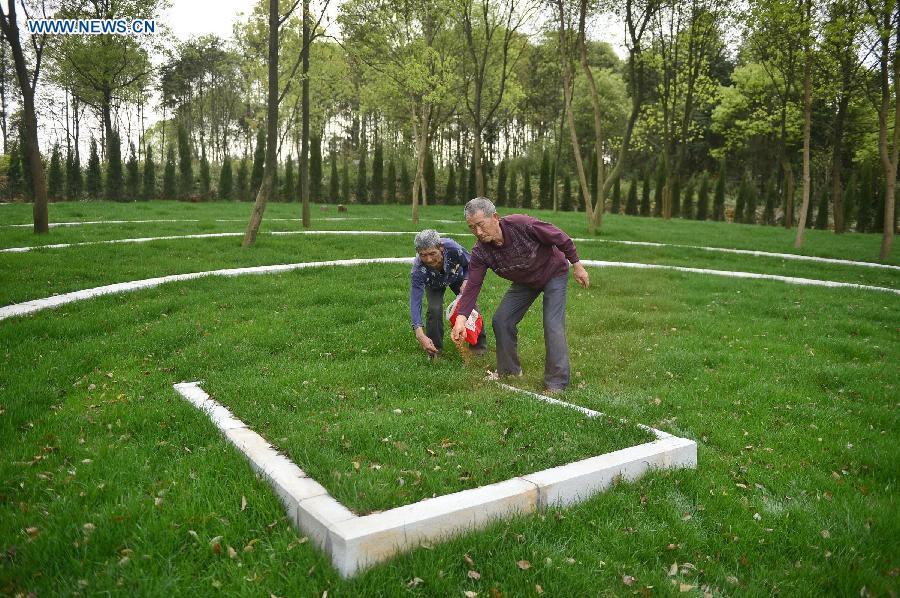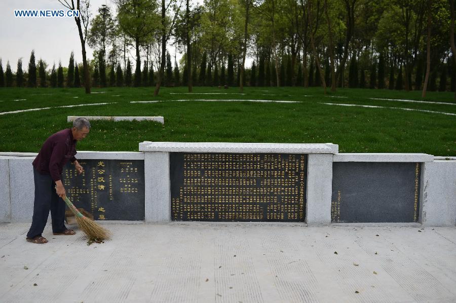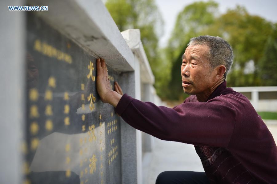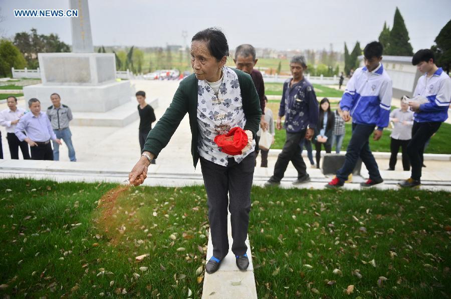 Sons of You Hanqing, a soldier of the Chinese army who fought in the Anti-Japanese War, spread red soil they brought fom southwest China's Yunan, their hometown, at a cemetery for anti-Japanese martyrs in Longtan Town of Gao'an City, east China's Jiangxi province, April 1, 2015. A group of descendants of Anti-Japanese War heroes gathered at the cemetery for commemoration as the Qingming Festival, or the Tomb-Sweeping Day, draws near. (Photo: Xinhua/Zhou Mi)