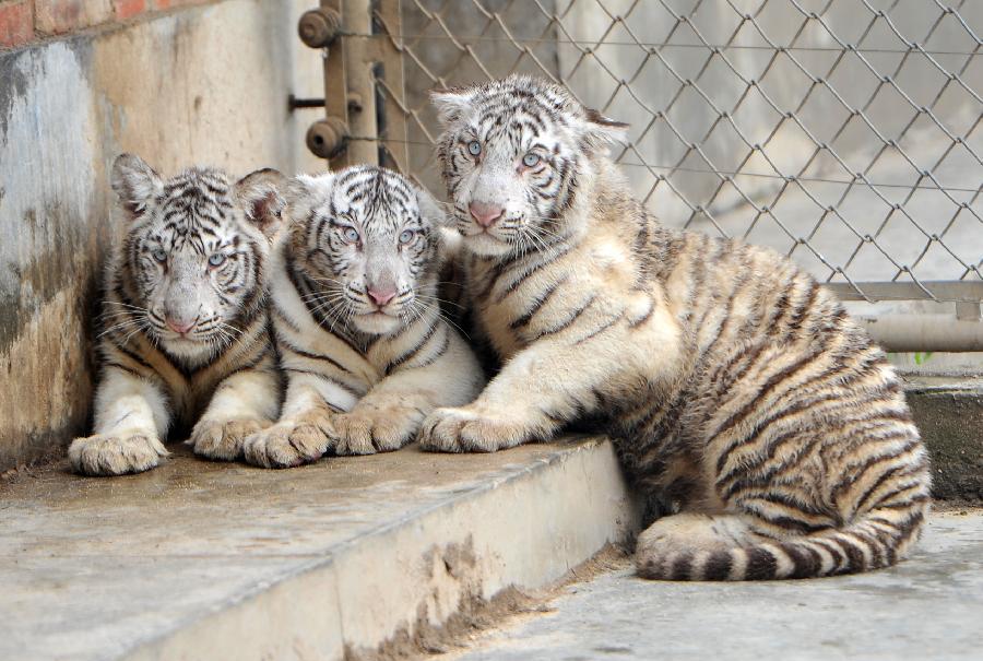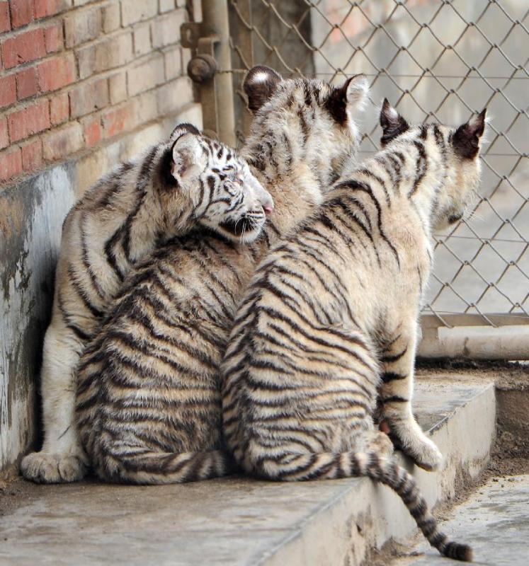 Photo taken on April 2, 2015 shows the white tiger triplets at Qingling Wildlife Park in Xi'an, capital of northwest China's Shaanxi province. Given birth by a tiger named "Lele" on Dec. 21 last year, the triplets made their first public appearance on Thursday. (Photo: Xinhua/Ding Haitao)